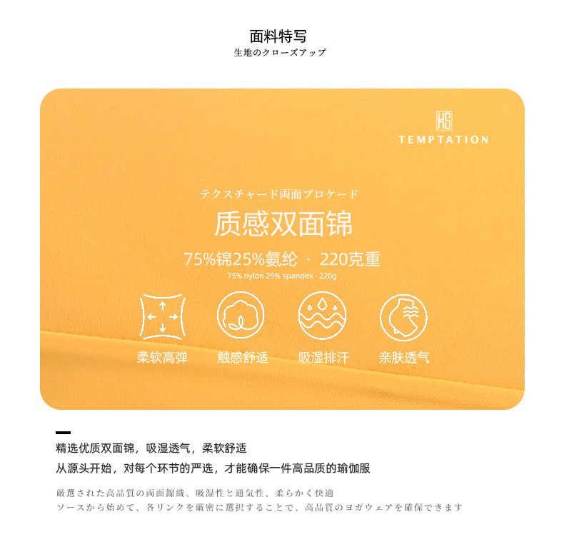 采用的是高质感的双面锦纶纤维,还加入了25%的高优质氨纶,兼顾运动中衣服带来的舒适度和耐磨损度。