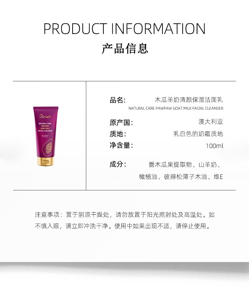 【中欧班列精选2支】澳大利亚 原装进口 澳莉维亚木瓜羊奶清颜保湿洁面乳 100ml/瓶