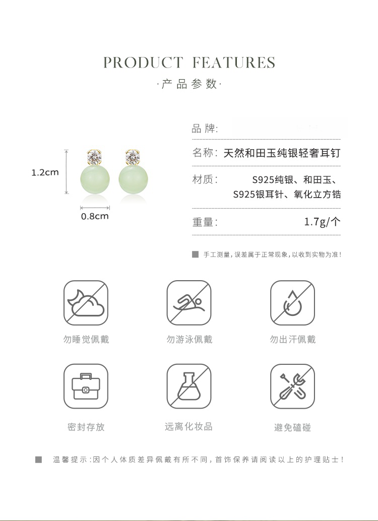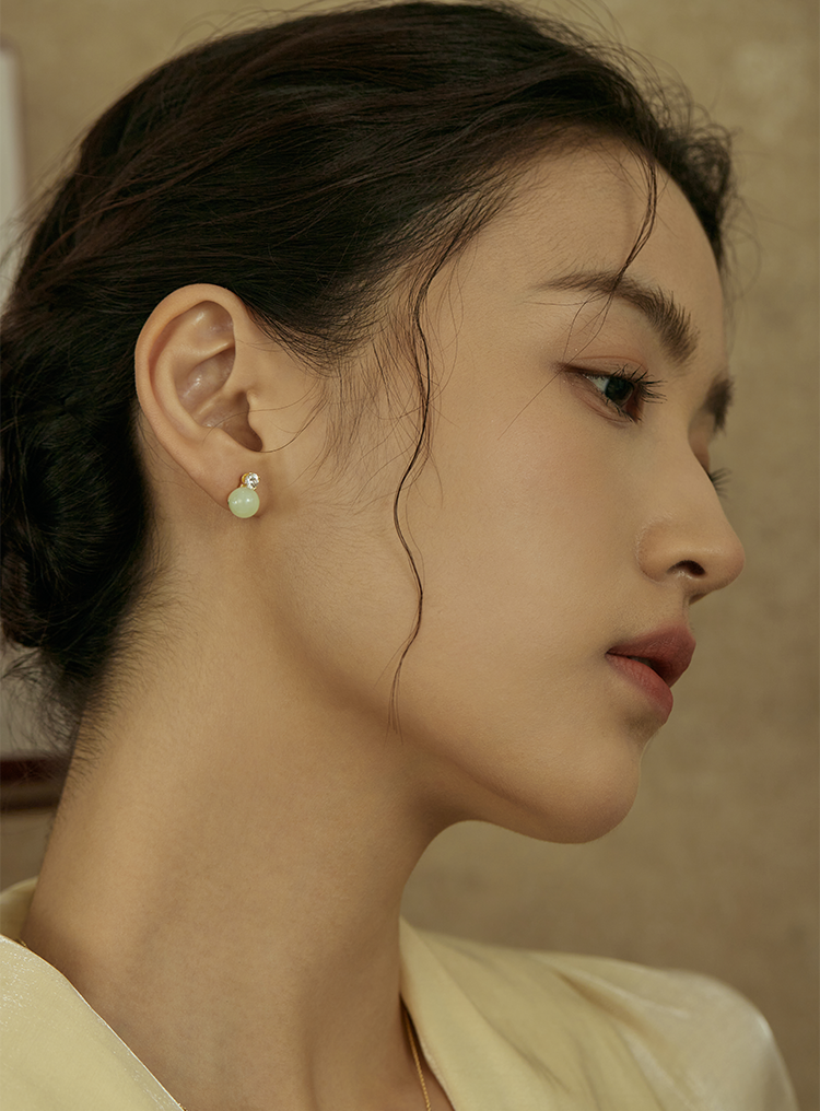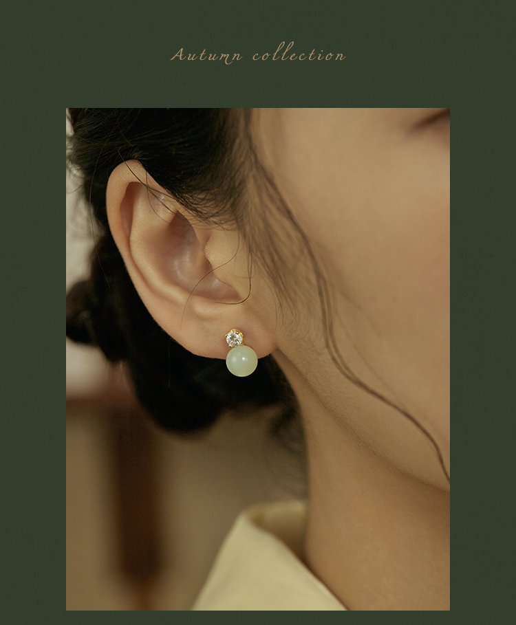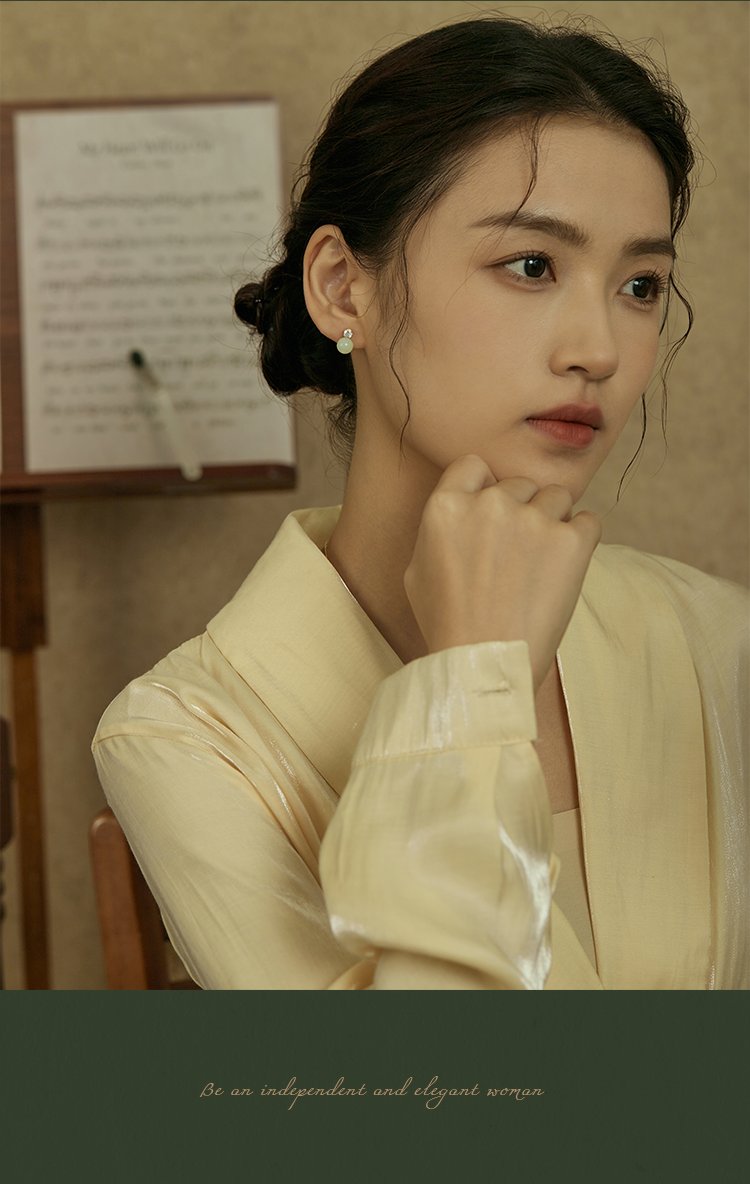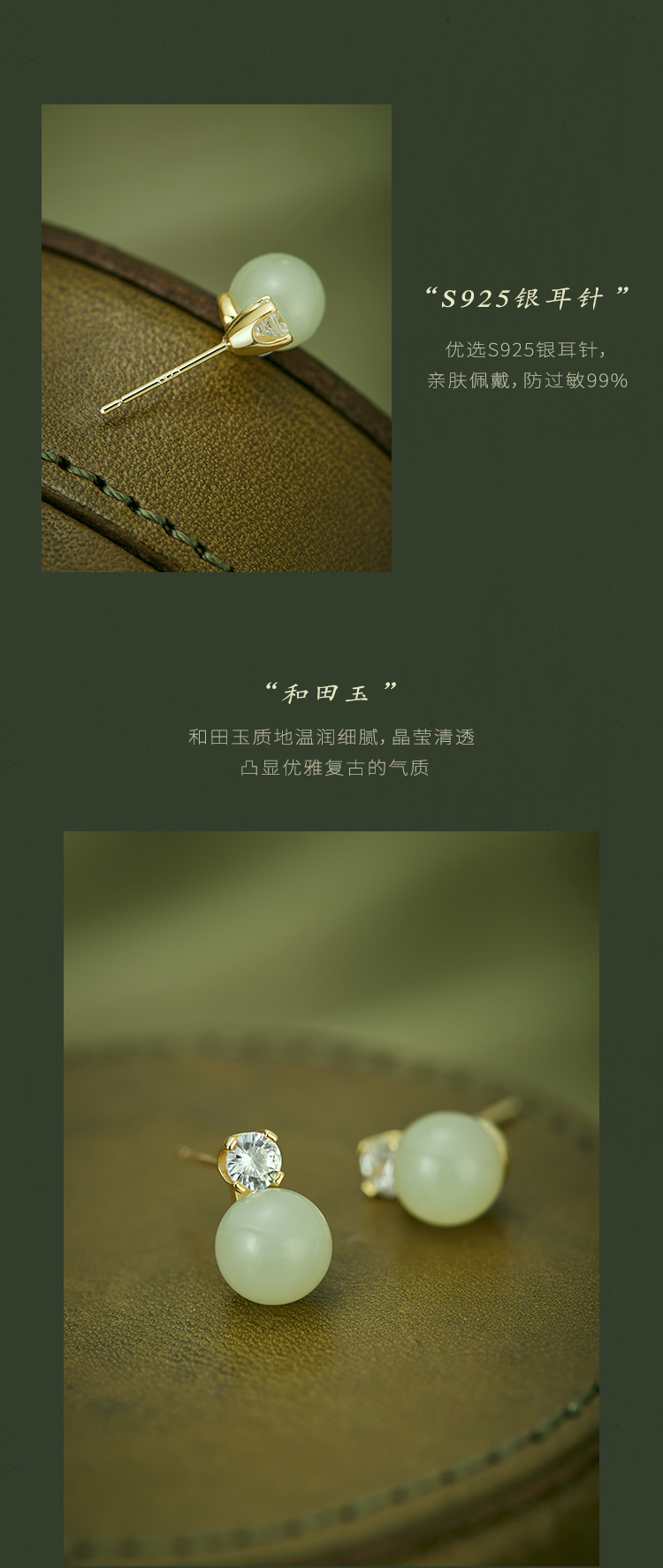 Oflye潮流饰品 天然和田玉耳饰女戴妃款古风轻奢小众925纯银耳钉气质复古耳环