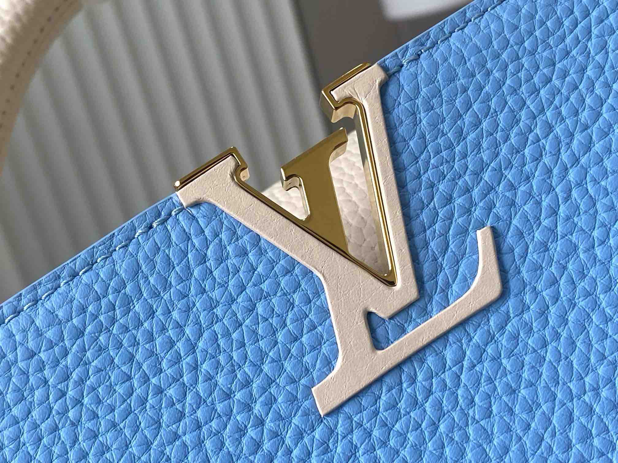 秋冬特惠💰1630 渠道级LV 新品 te级LV 全套包装 M21887/M48865蓝拼白链条款 此款Taurilon皮革版Capucines 手袋呈现柔美清新的色调 令人眼前一亮 除了标志性的ding都皮革手柄 另配可脱卸、可调节编结皮革链式包带 便于肩背或斜挎 包内设有隔层和拉链口袋 可存放贵重物品 Size:27 * 18 * 9 cm