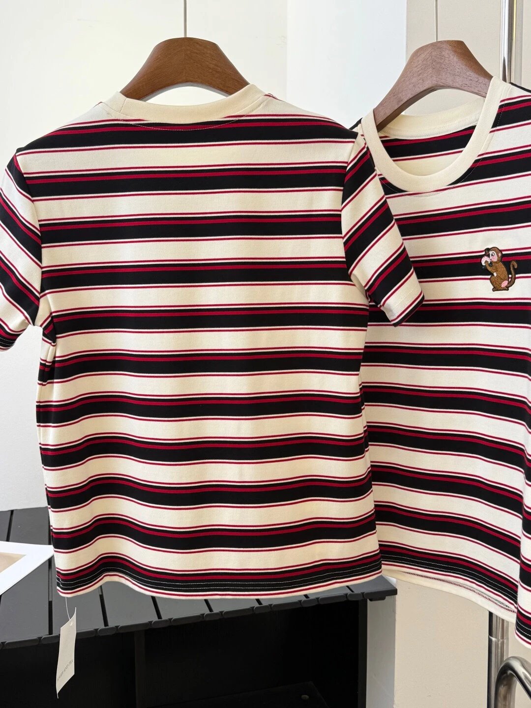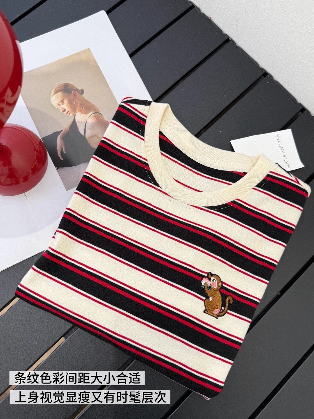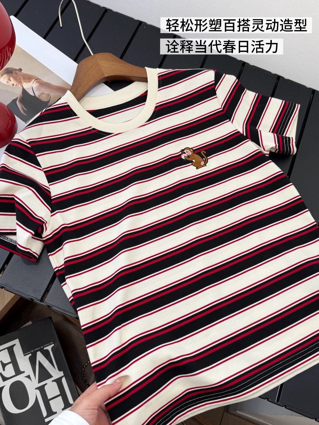 谁穿谁好看系列!这款红黑条纹T恤上身超有范儿,宽松版型藏肉显瘦,小猴刺绣点睛又讨喜,单穿叠穿都出彩,开春就靠它拿捏氛围感‼️