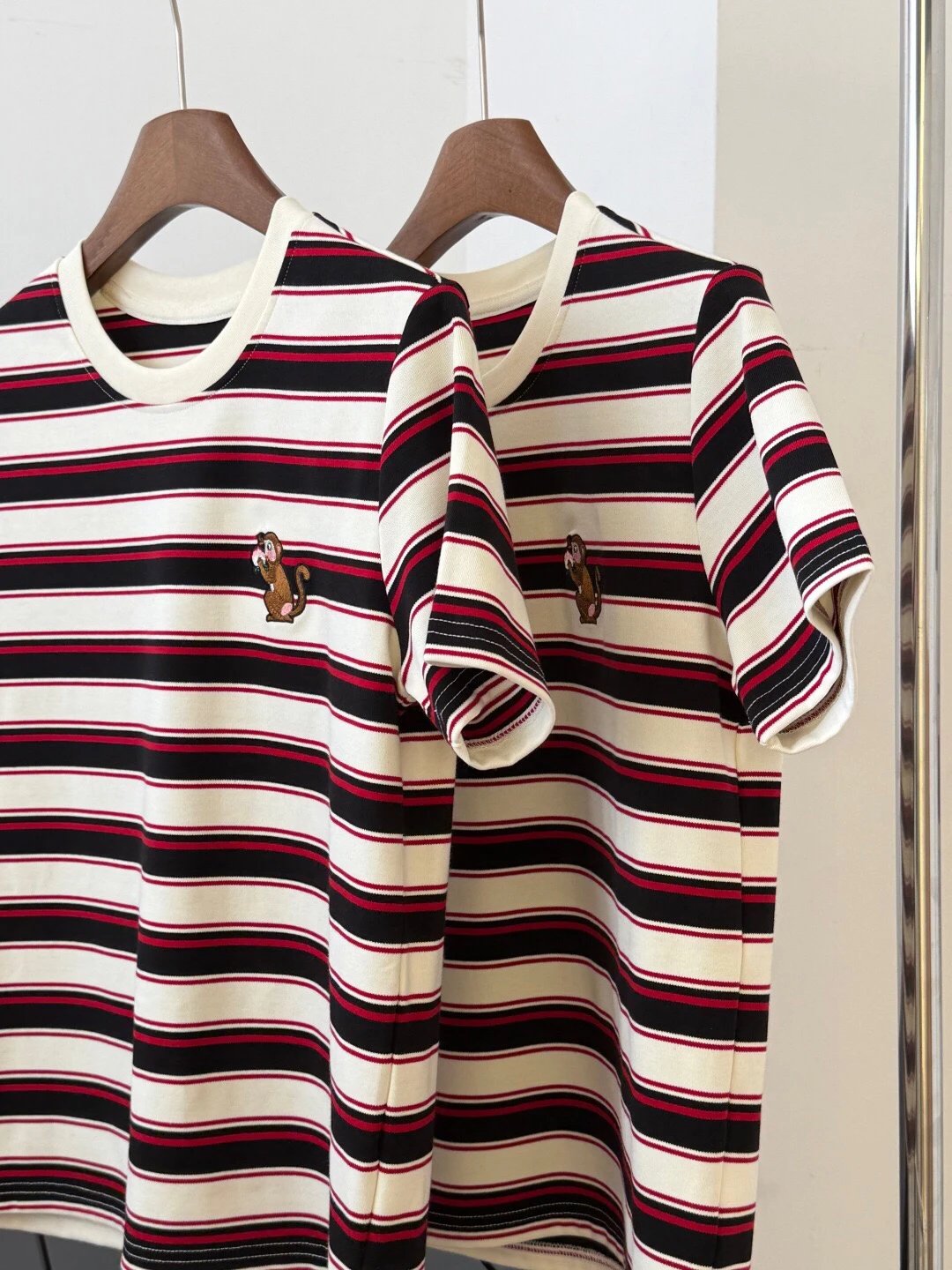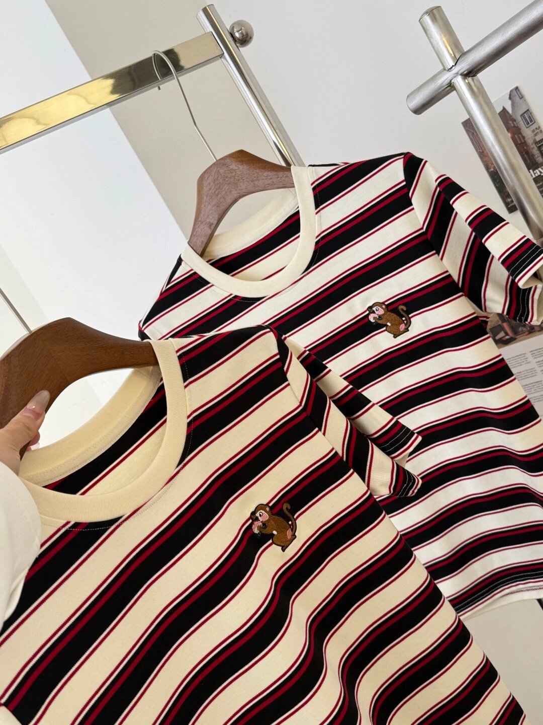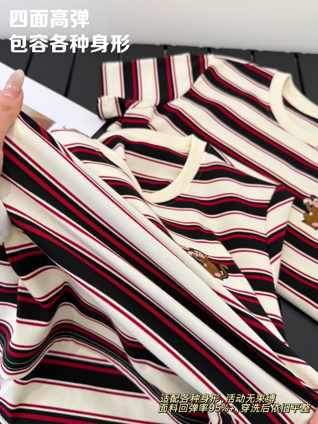 谁穿谁好看系列!这款红黑条纹T恤上身超有范儿,宽松版型藏肉显瘦,小猴刺绣点睛又讨喜,单穿叠穿都出彩,开春就靠它拿捏氛围感‼️