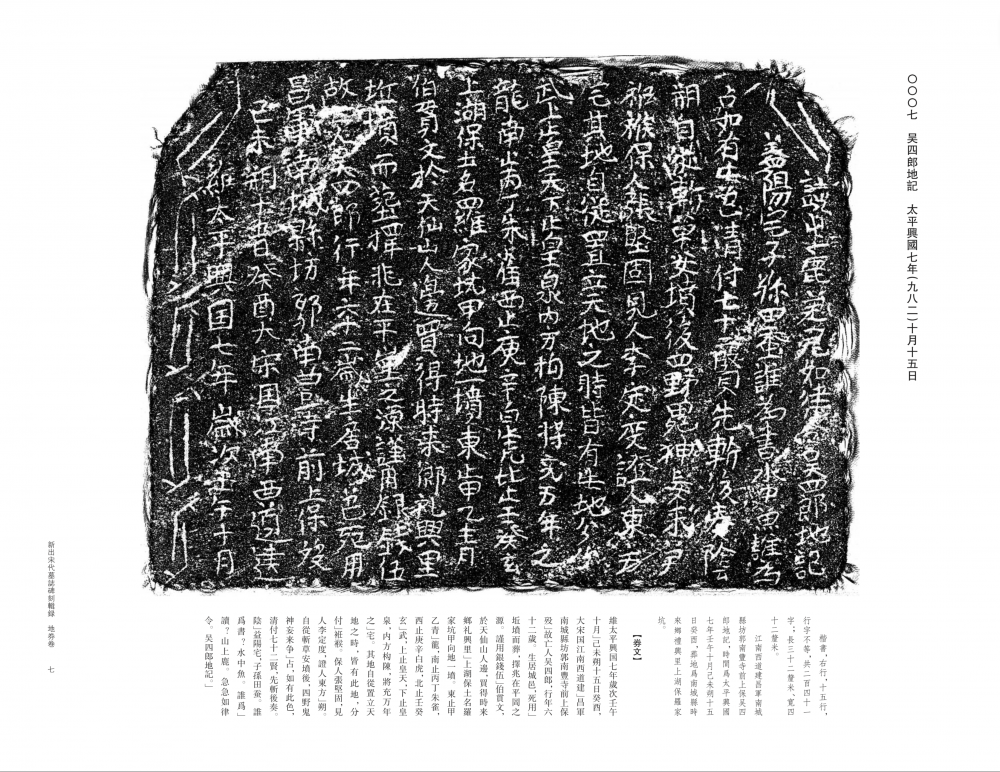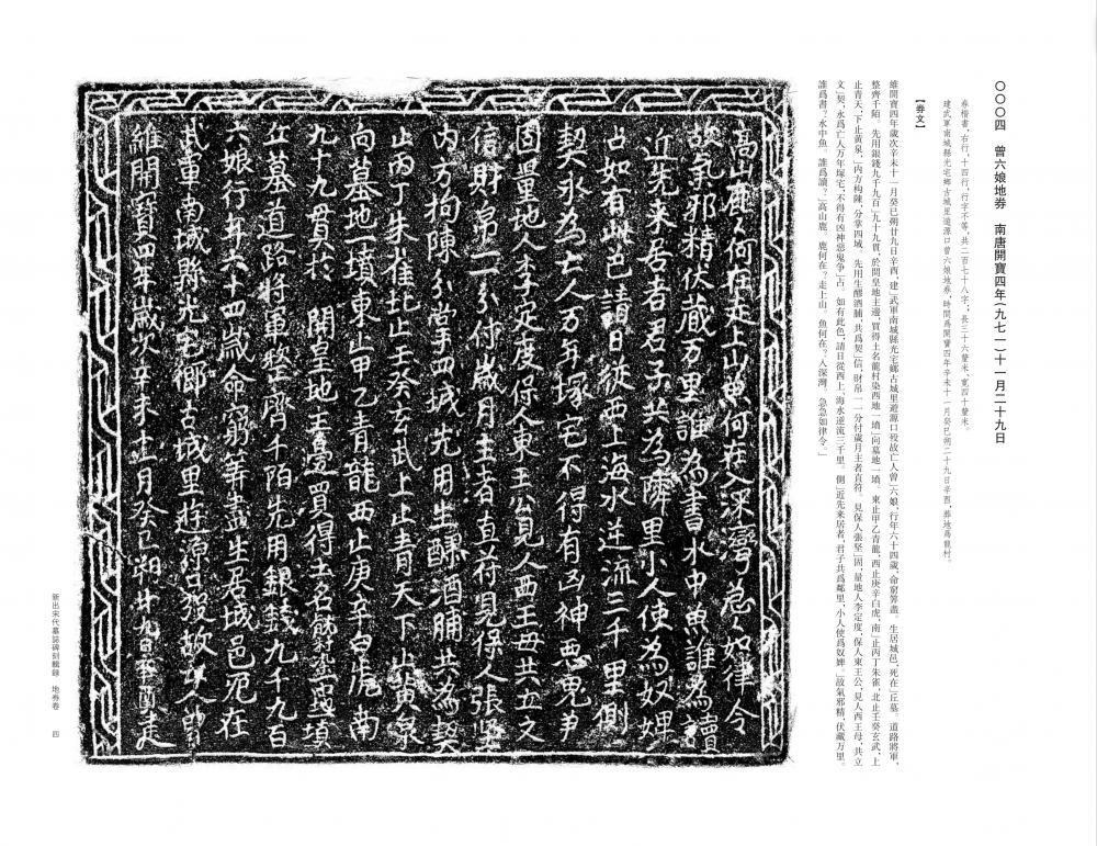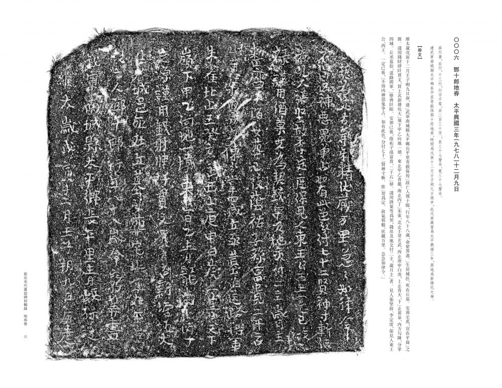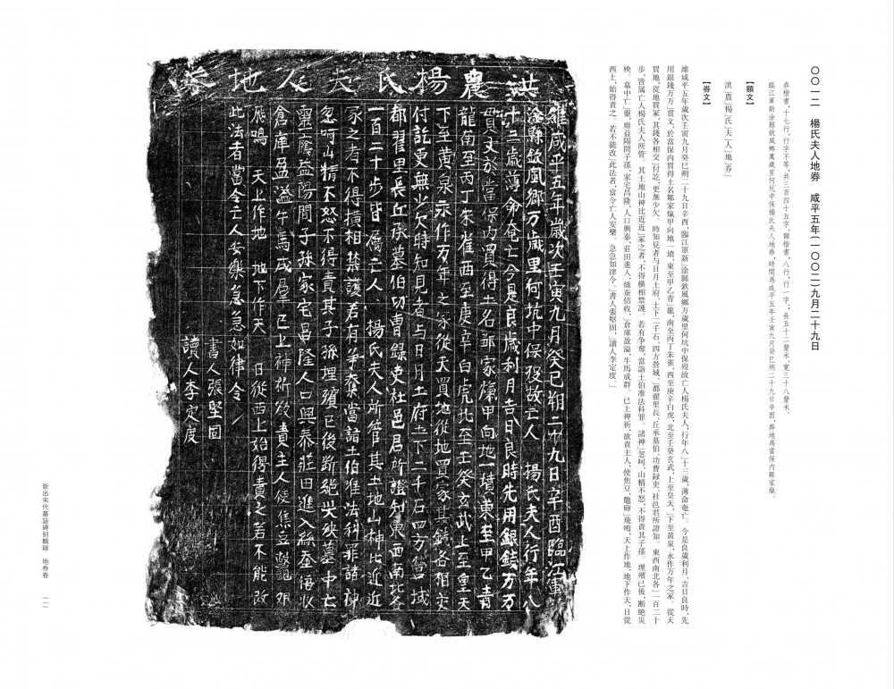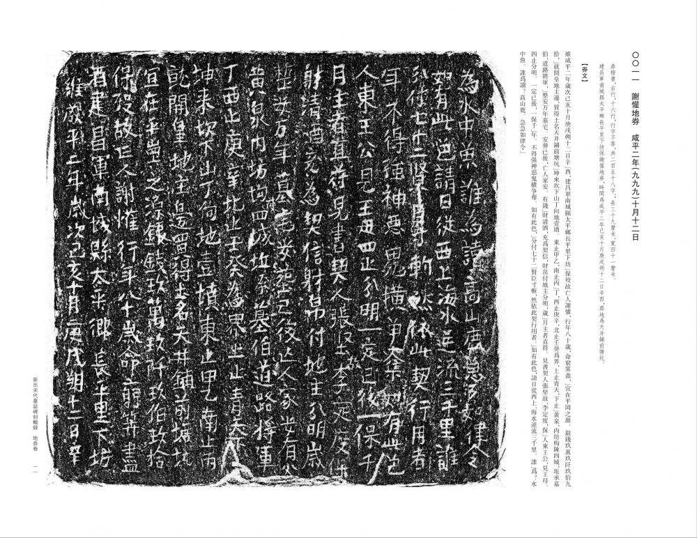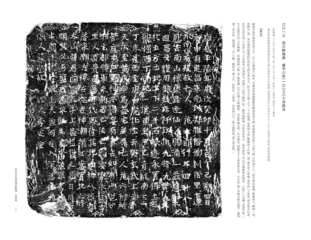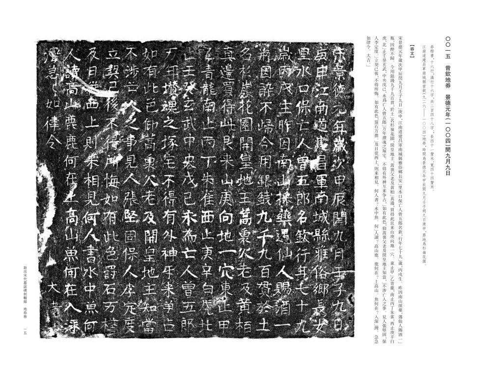 本书共收宋代(含同时段五代金元)的地券1039种,绝大部分是首次发表。其中有纪年的1001种:南汉一种,南唐四种,北宋329种,南宋664种,金代一种,元代二种。从地域分布而言,江西1029种,其他地域十种:广州一种、镇戎军一种、秦州二种、岷州一种、成都一种、京兆二种、怀州河内县一种、邵武一种。也就是说,本书所收地券绝大部分出土于宋代的江南东路和江南西路。江西一直是宋代地券出土的重要的区域,其巨大的数量,使其拥有了独特的研究价值。