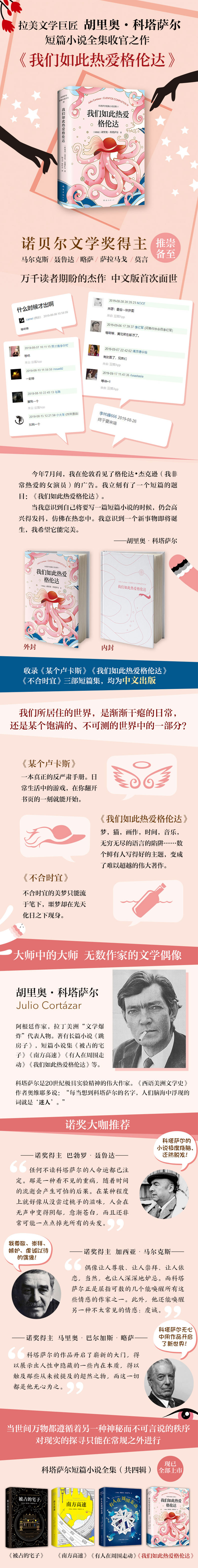 某个卢卡斯大摇大摆地介绍着某个科塔萨尔,乐此不疲,合情合理地质疑寻常的规矩,写到一半的对话和爱情已经述尽了哲理;对女演员的热爱升华为臻于完·美的纯粹,狂热的支持者们追求着臻于纯粹的完·美;不合时宜的美梦只能流于笔下,噩梦却在光天化日之下现身……在科塔萨尔的世界里,生活似乎发生了精妙的错位,谜一般的信号自异世界传来。变幻莫测的因素渗入日渐令人不安的现实,故事就在感知的边界发生,违反了一切常理逻辑,却毫无阻碍地驶向命定的结局。