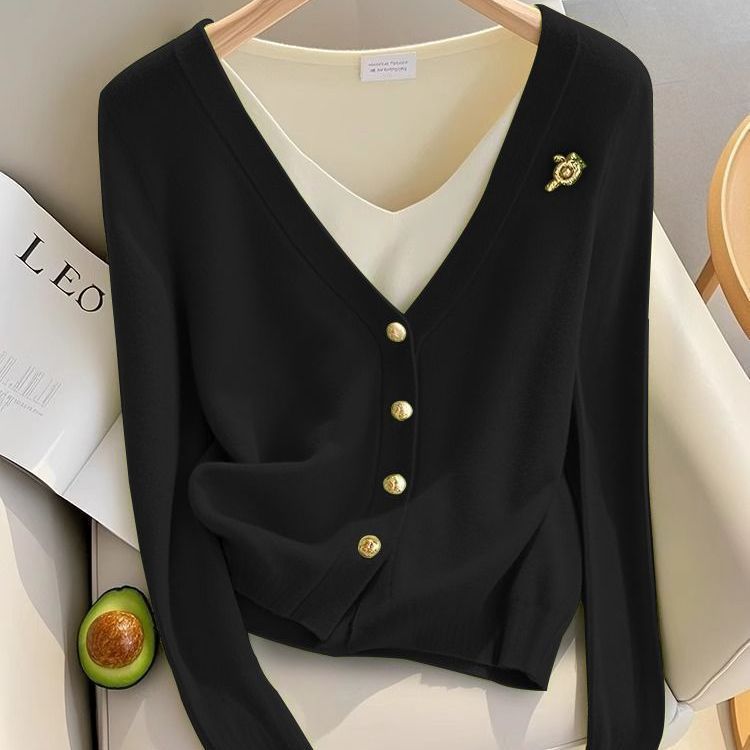 秋季【法式小香风假两件】绿色针织开衫 独特超好看 新款内搭打底上衣