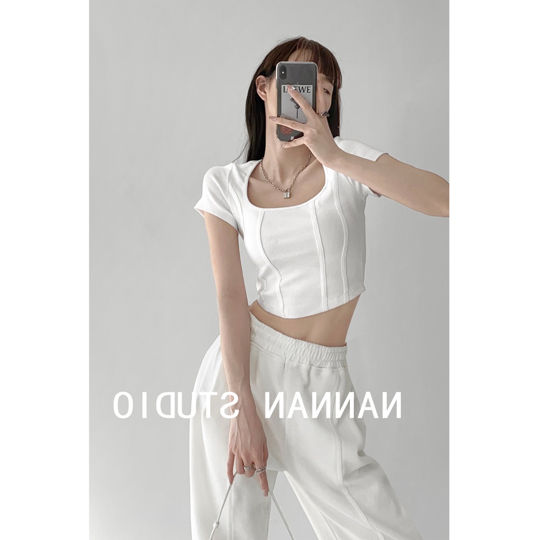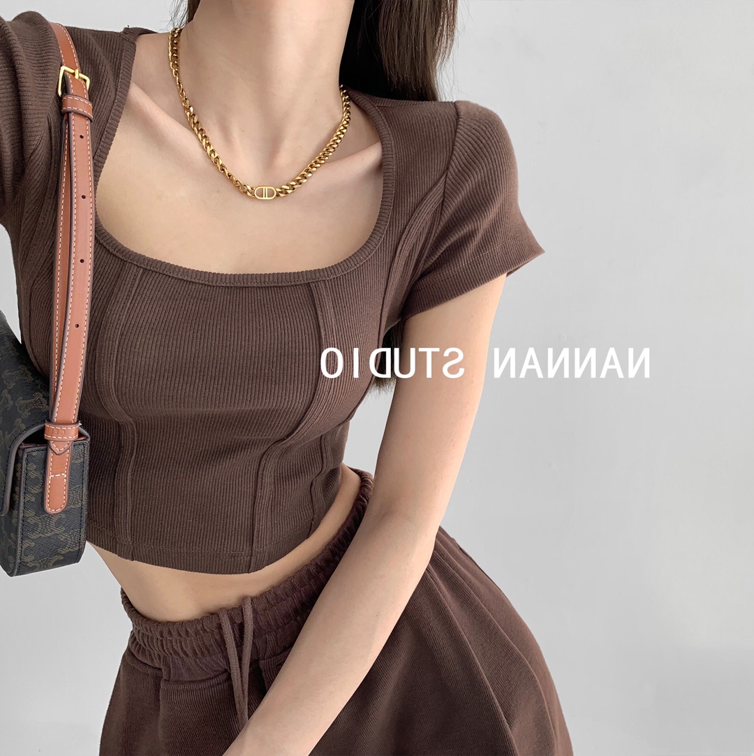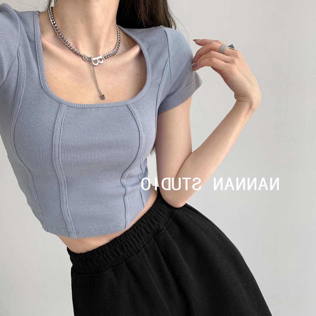【社群供V】2022夏季新款 复古立体鱼骨线条修身打底衫ins风(下单后五天内发货)