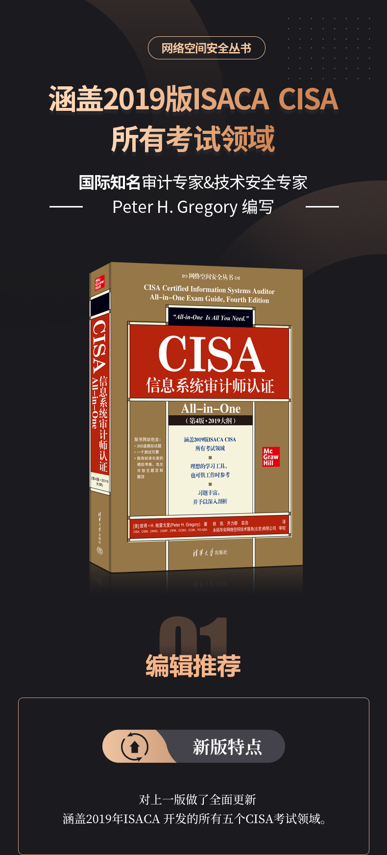《CISA信息系统审计师认证All-in-One(第4版 • 2019大纲)》由很好审计专家撰写,对上一版做了全面更新,内容权威,涵盖2019年ISACA 开发的所有五个CISA考试领域。每章开头列出学习目标,文中穿插考试提示,章末包含小结、本章要点、习题和答案。本书旨在帮助考生更轻松地通过CISA考试,也可供IS审计新人和资深人士在工作期间参考。