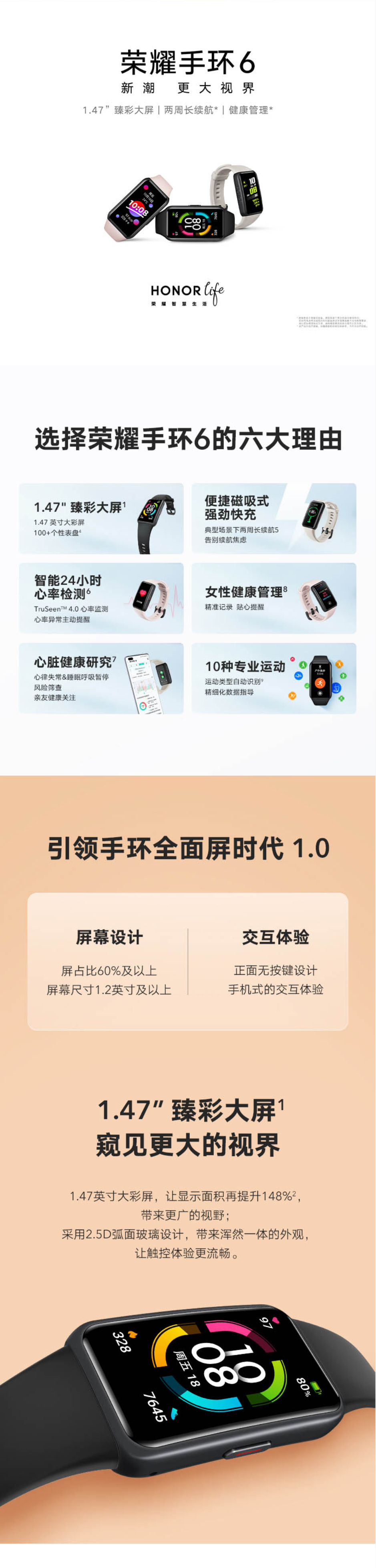 荣耀手环6 珊瑚粉 1.47英寸臻彩大屏 14天续航10种运动 心率血氧睡眠 女性生理周期 50米防水 ARG-B19/B39