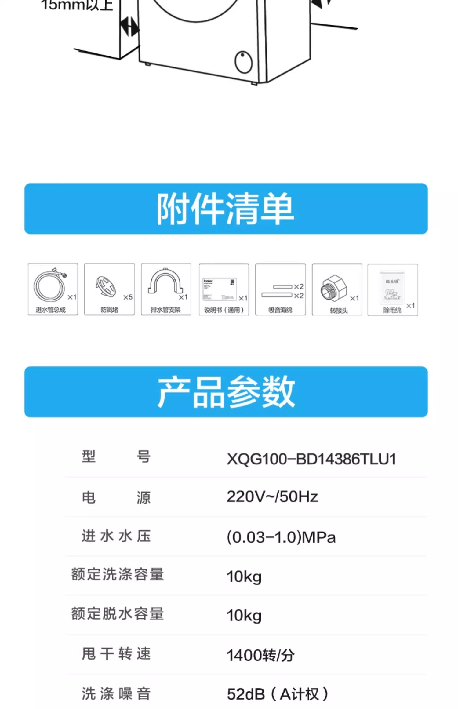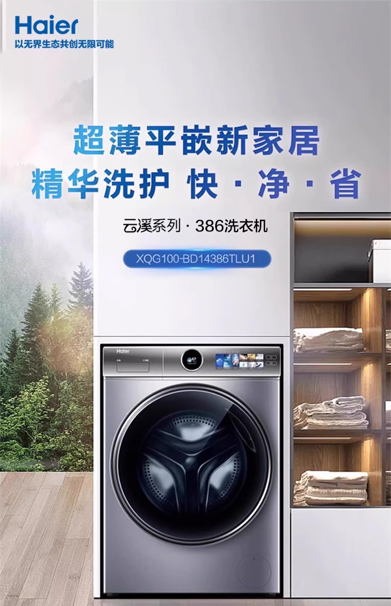 [云溪冠军版]海尔平嵌精华洗直驱10kg全自动家用滚筒洗衣机386 单洗XQG100-BD14386TLU1