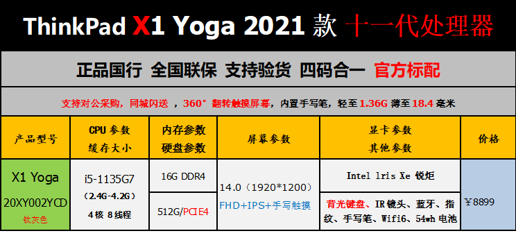 (国行)ThinkPad X1 Yoga 2021 英特尔Evo平台 14英寸翻转触控屏笔记本电脑