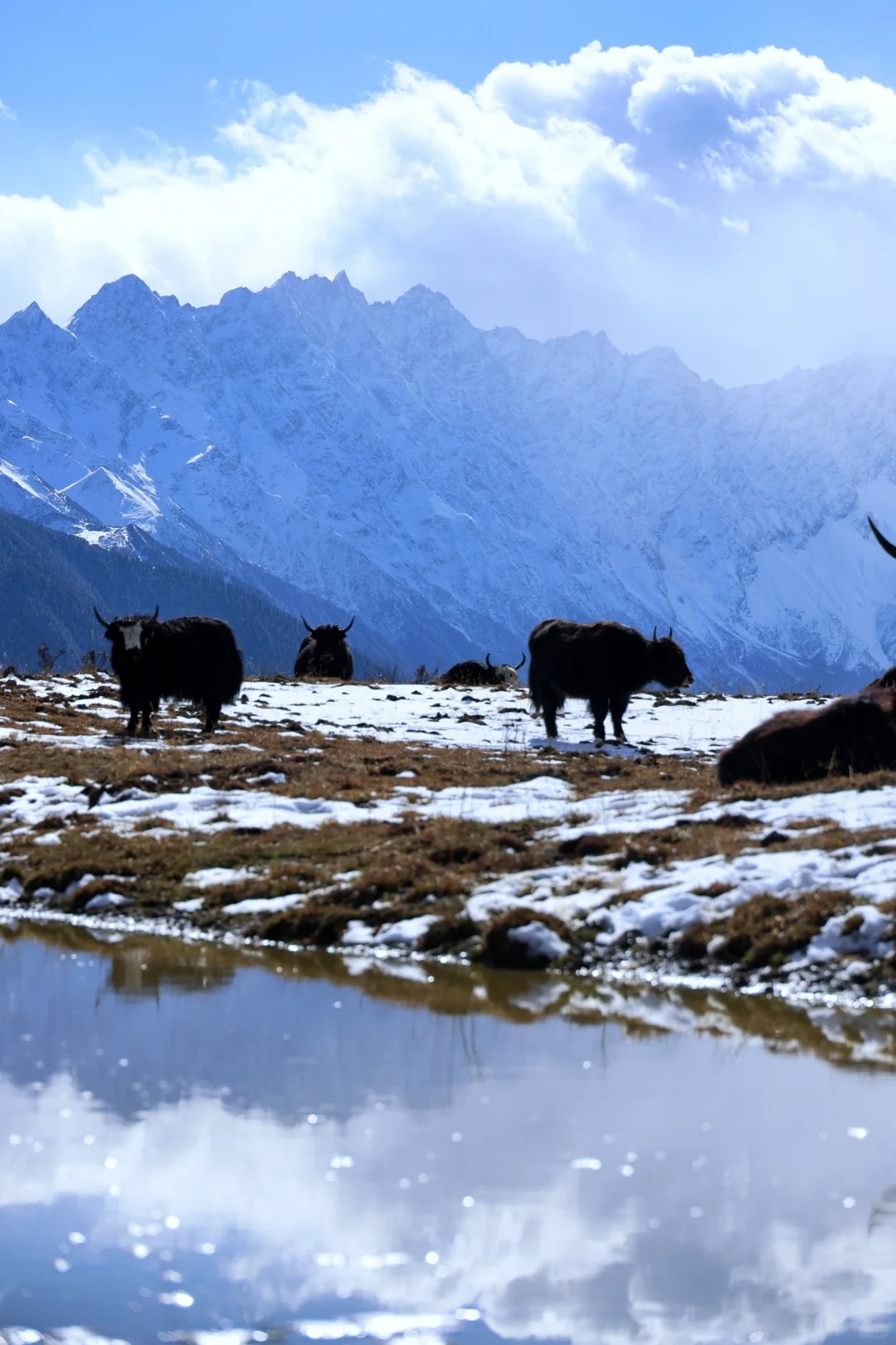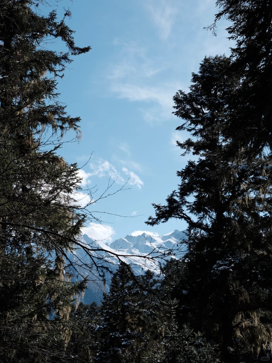 徒步约 2.5 公里,海拔攀升至 3000 米左右,眼前豁然开朗 —— 斯博迪高山牧场到了。这片宽阔的牧场被白雪全覆盖,像一块巨大的白绒毯铺在山间。四面环山,抬头望去,猛古雪山、霸王雪山、虹桥雪山等多座雪峰一字排开,巍峨耸立