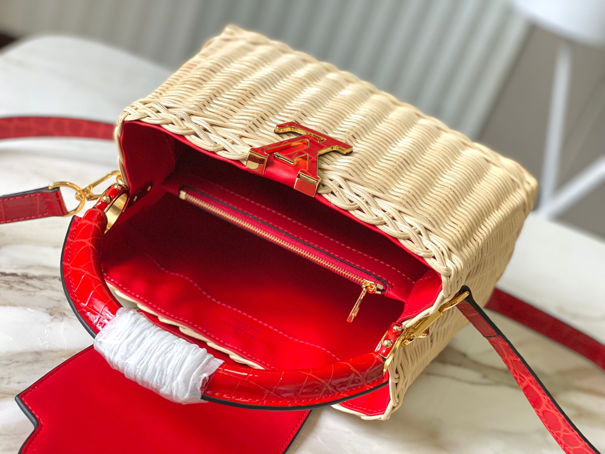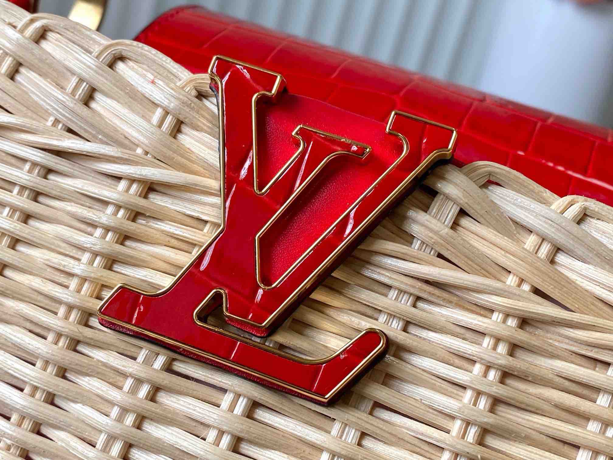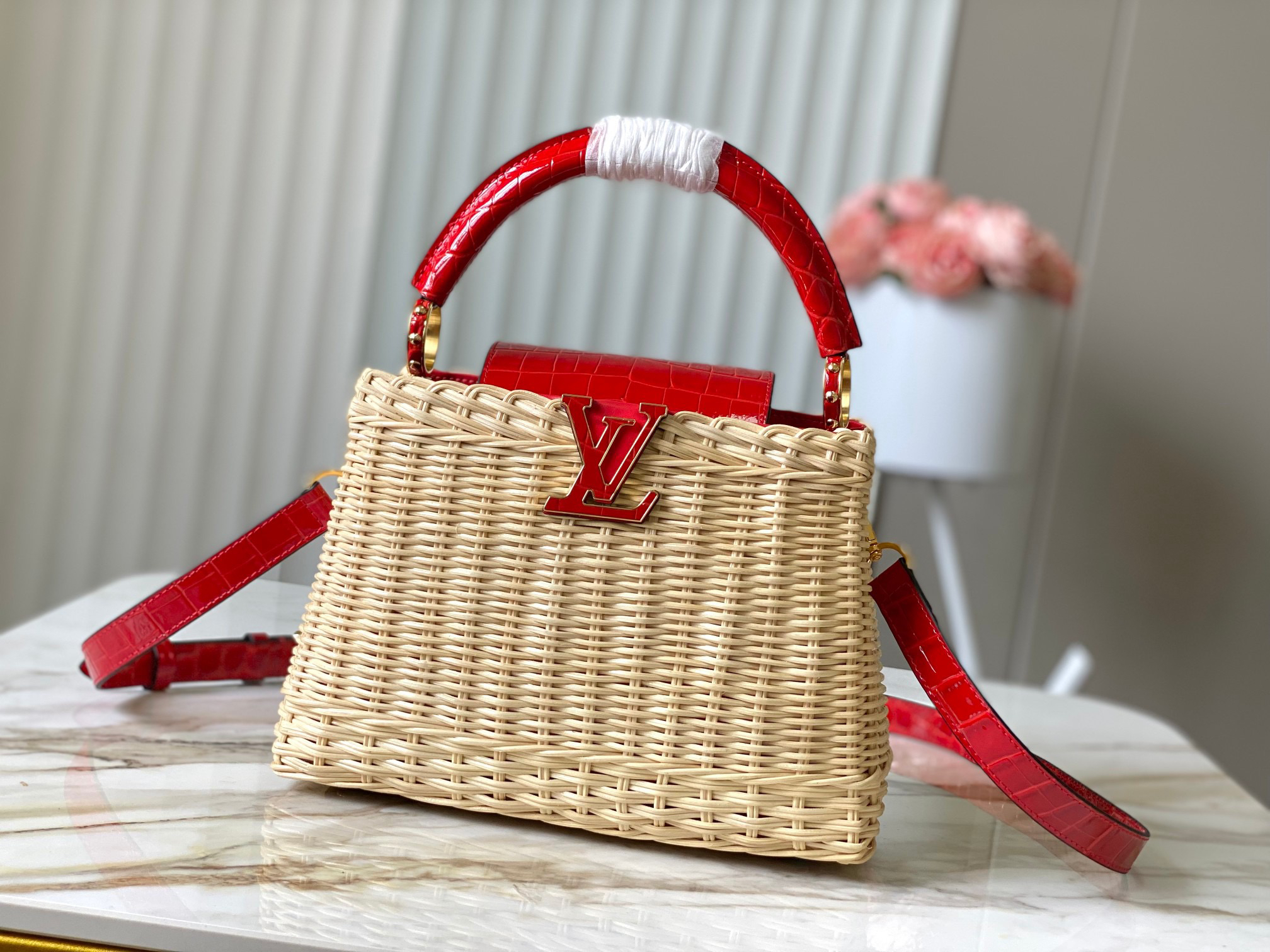 秋冬特惠💰1700 渠道级LV 新品 te级LV 动态芯片 N85520/M48865红鳄鱼竹篮 本款Capucines手袋向路易威登于1892年推出的Picnic 硬箱汲取灵感 洋溢浓郁夏日风情 藤条包身需要数天的匠心编织方可完成 皮革饰边和耀目LV 字母完善细节 斜挎、肩背或手提皆宜 Size : 27 * 18 * 9 CM