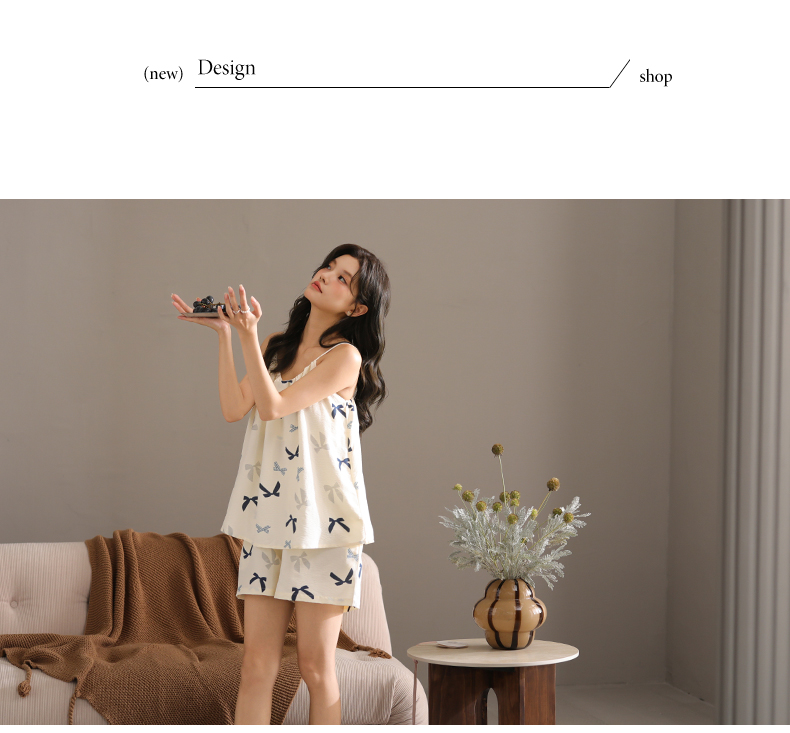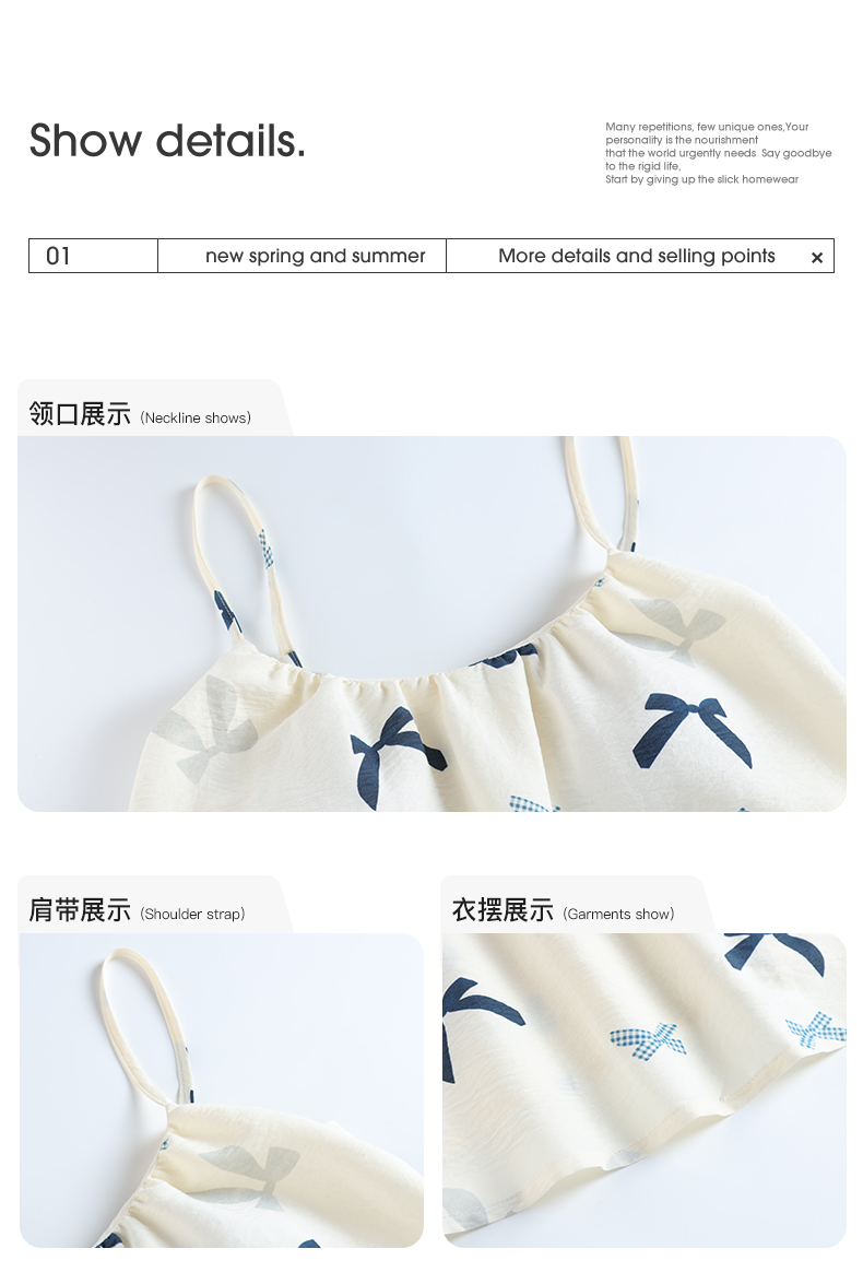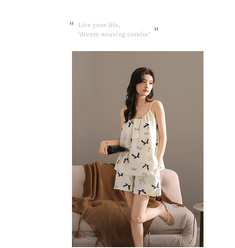 可人儿带bra泡泡绵女士吊带短裤睡衣夏季可外出家居服长裤三件套