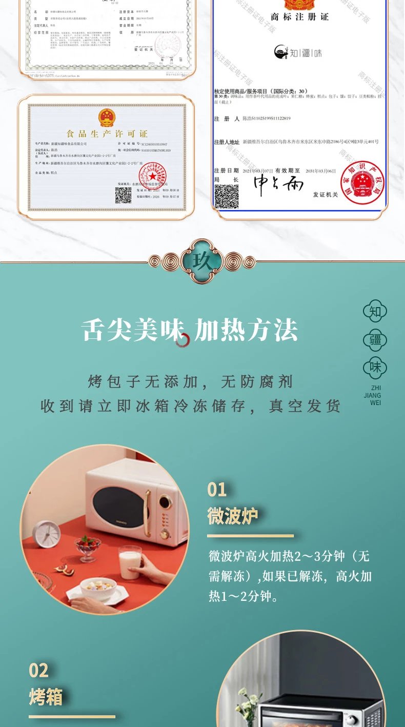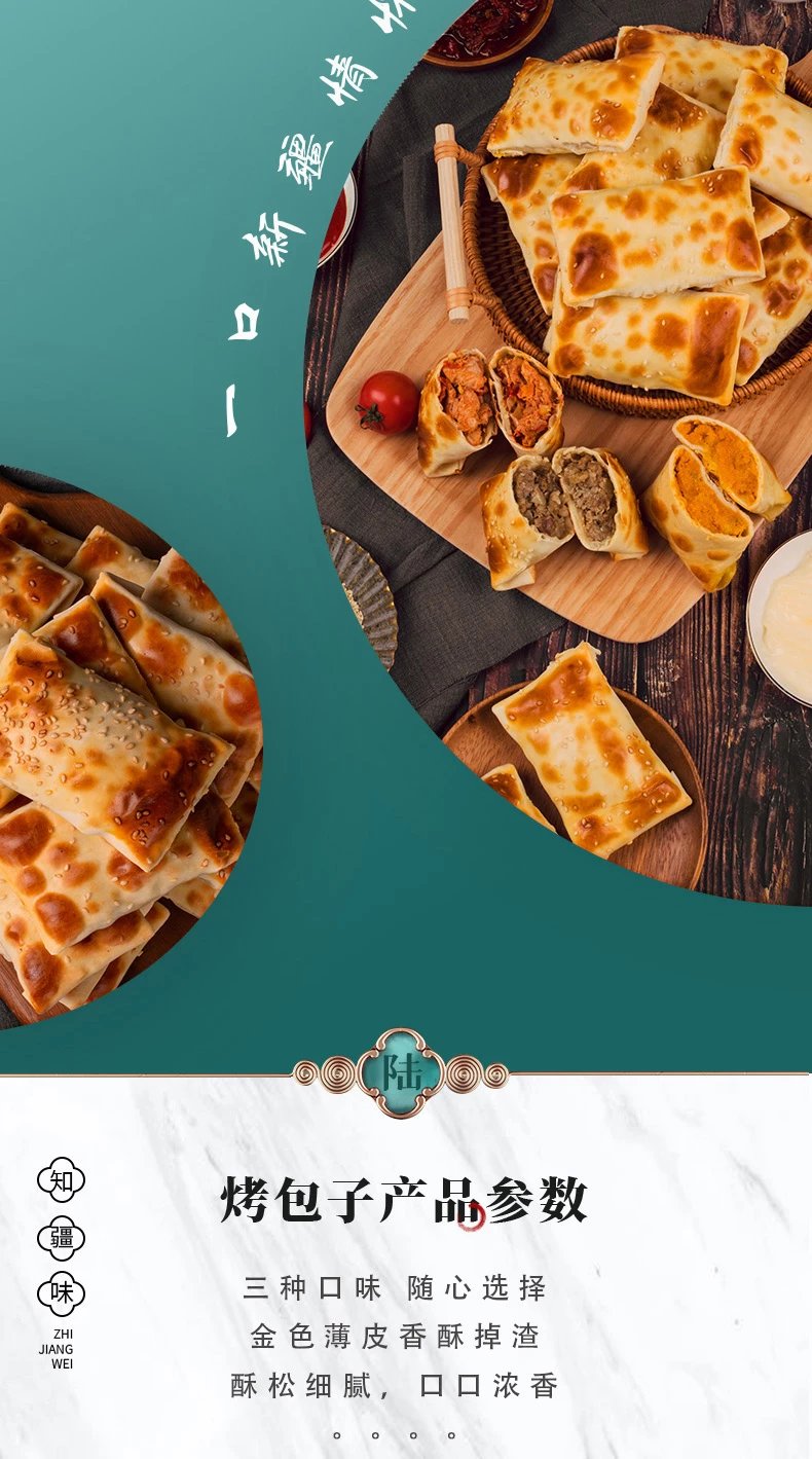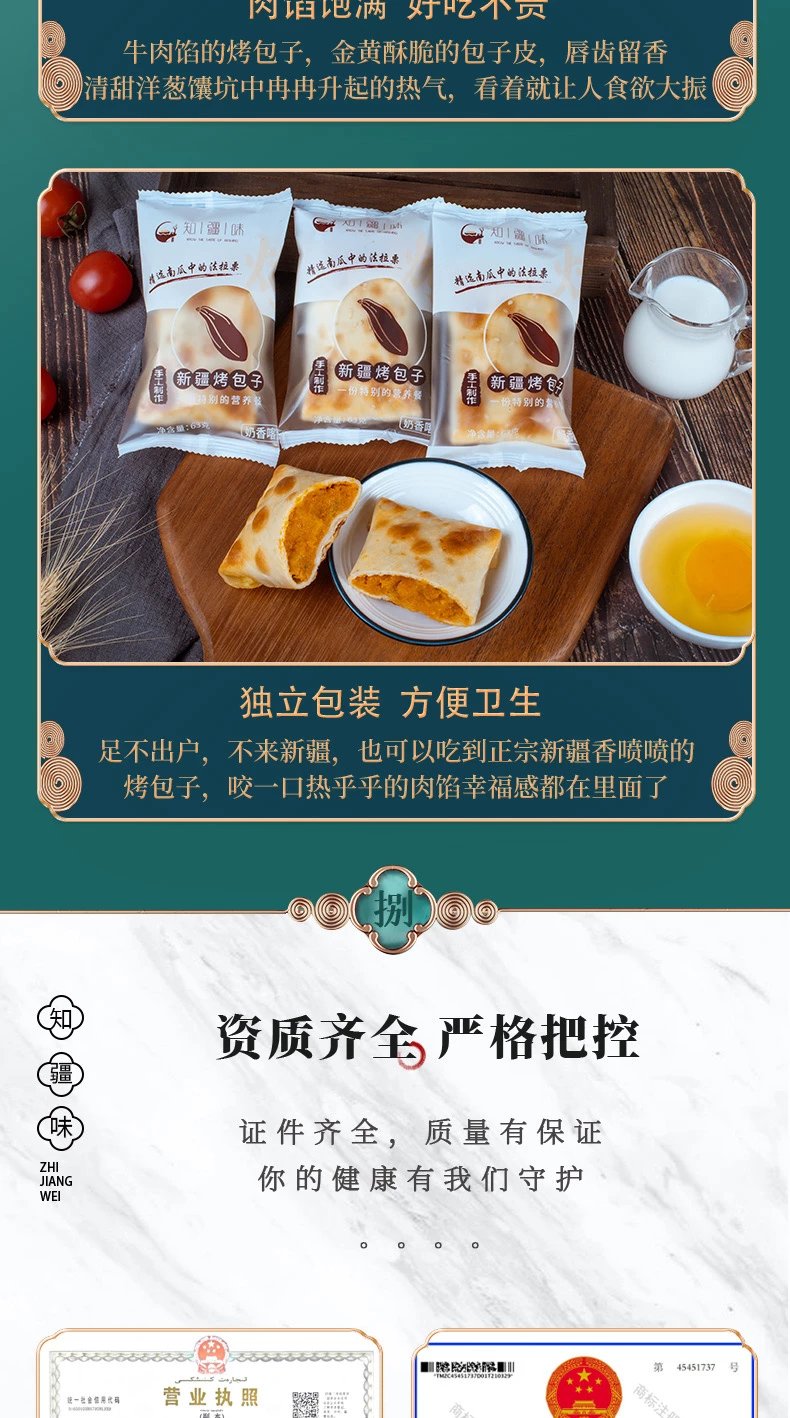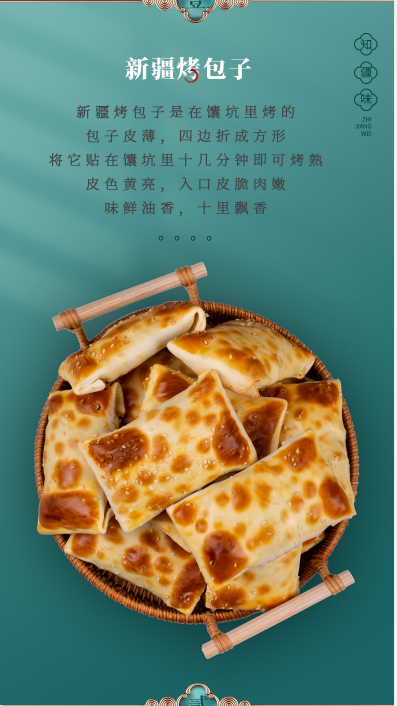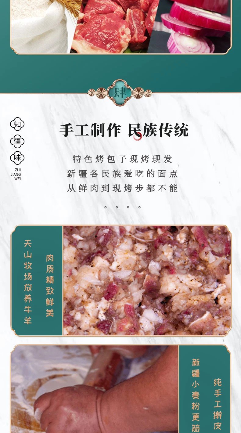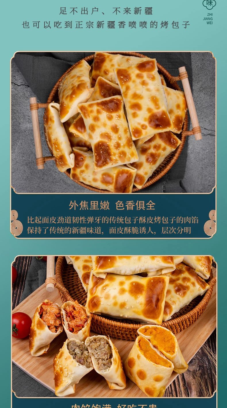 【卖点】 新疆酥皮烤包子--选用新疆当地新鲜牛羊鸡肉吃一口让人神魂颠倒 有谁能拒绝这一口的酥香油润馅料足,超满足维语“撒木萨”,配料表超级干净吃着更放心,吃一次就能征服您味蕾的新疆尤物 快把它带回家吧 源自新疆,精选食材:采用新疆本土新鲜牛羊肉后腿,肉质紧致,大块大块的土鸡鸡肉,整肉切块再切丁,不绞馅,肉粒颗颗分明看得见,酥皮之下,还原地道风味。配料表干净:制作过程中,不额外添加香精、防腐剂,配料表干干净净,原汁原味,健康营养 多种口味,任君选择:烤肉味(牛肉)、羊肉味、辣子鸡丁味3种口味满足您挑剔的味蕾 口感细腻,香而不腻:圆鼓鼓得像一 个个小枕头,面皮外酥里软,咬上一口满口流油,汁水丰盈,香而不腻! 资质齐全,严格把控:证件齐全,质量有保证,让您吃的放心,您的健康有我们守护 独立包装,方便卫生:足不出户,不来新疆,就可以吃到正宗新疆香喷喷的烤包子,咬一口热乎乎的肉馅幸福感都在里面 甄选食材,造就美味知疆味新疆炒馕精选优级小麦粉,搭配**香料传统和创意的碰撞层层风味叠加,成就麦香十足的炒馕 传统工艺,真心实意知疆味新疆炒馕条,坚持采用传统工艺制作馕饼 让您在家也能感受疆域风味 双重口味,任君选择知疆味新疆炒馕双种口味,香辣味开胃可口好过瘾 孜然味焦香美味嘎嘣脆 开袋即食,追剧必备知疆味新疆炒馕是自封袋包装,携带更加方便,随时随地都可以吃的小零食,追剧唠嗑必备单品 干脆酥香,口感正宗知疆味新疆炒馕一口鲜香,干脆酥香,色泽金黄,孜然辣椒与烤馕恰到好处的相互交融,散发出独特的香味,令人垂涎
