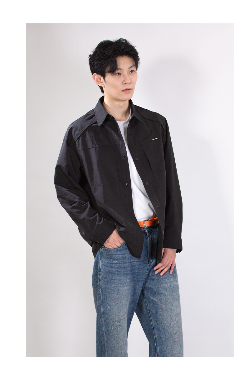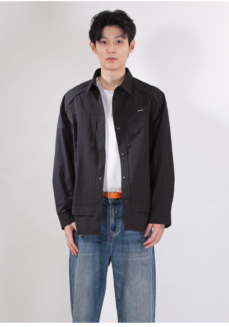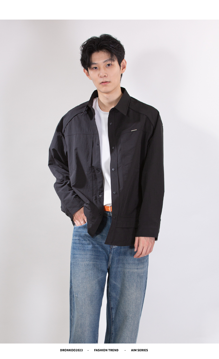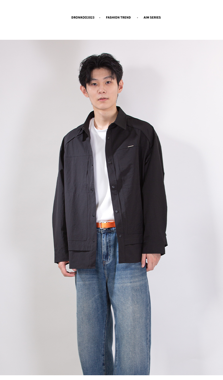 DRONKOO 2025 翻领左金属标前贴袋下摆假两件微阔长袖中厚衬衣