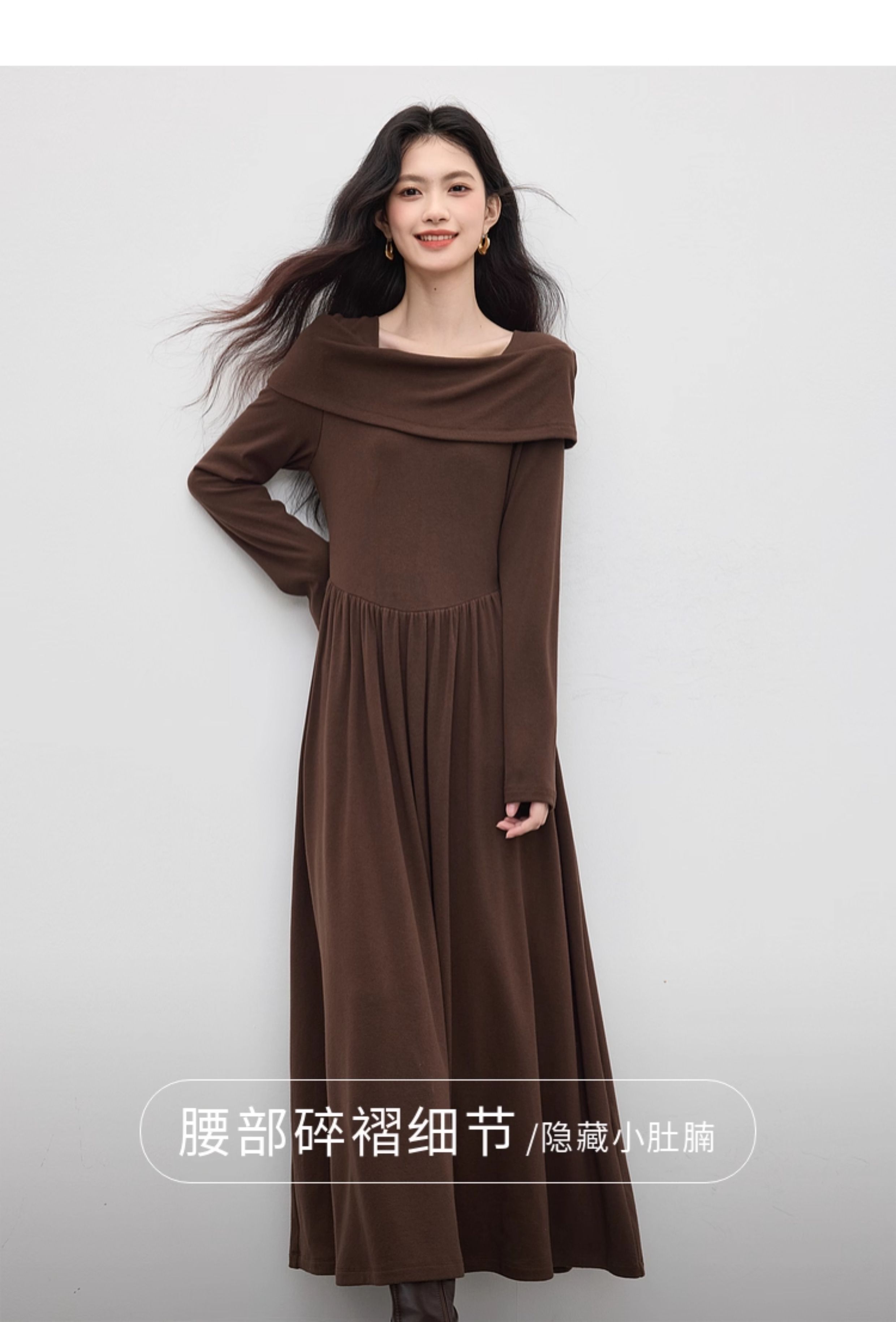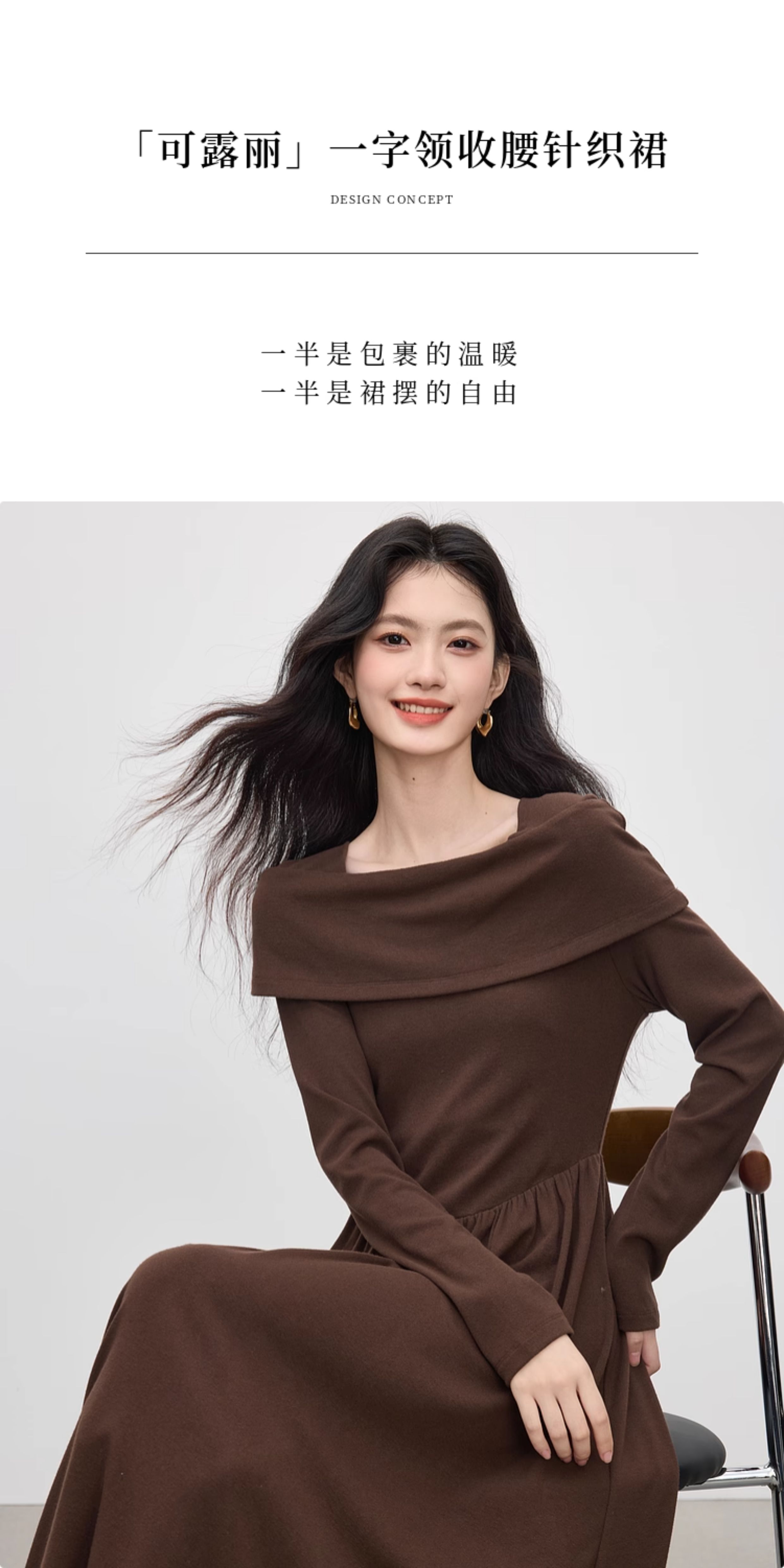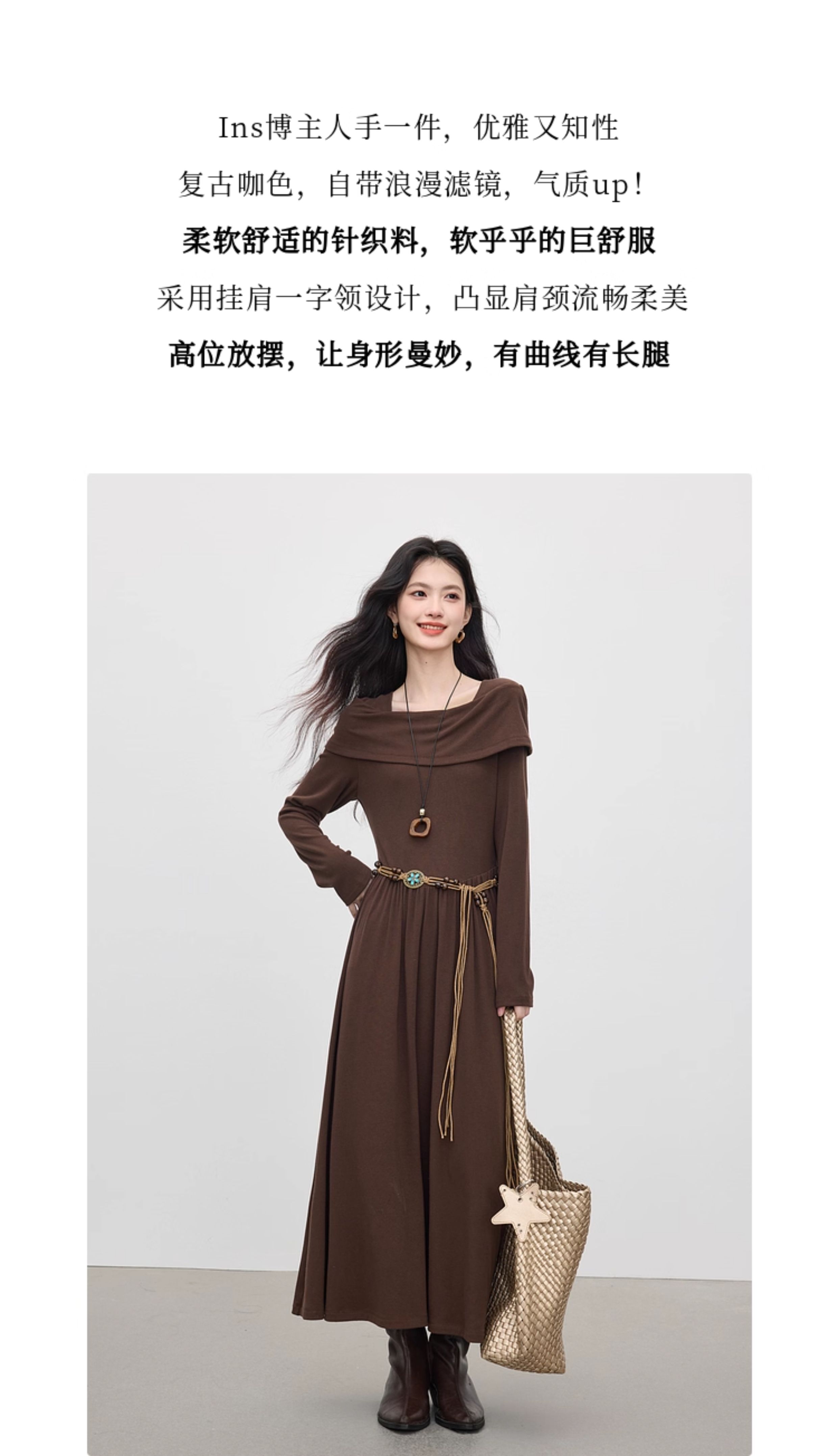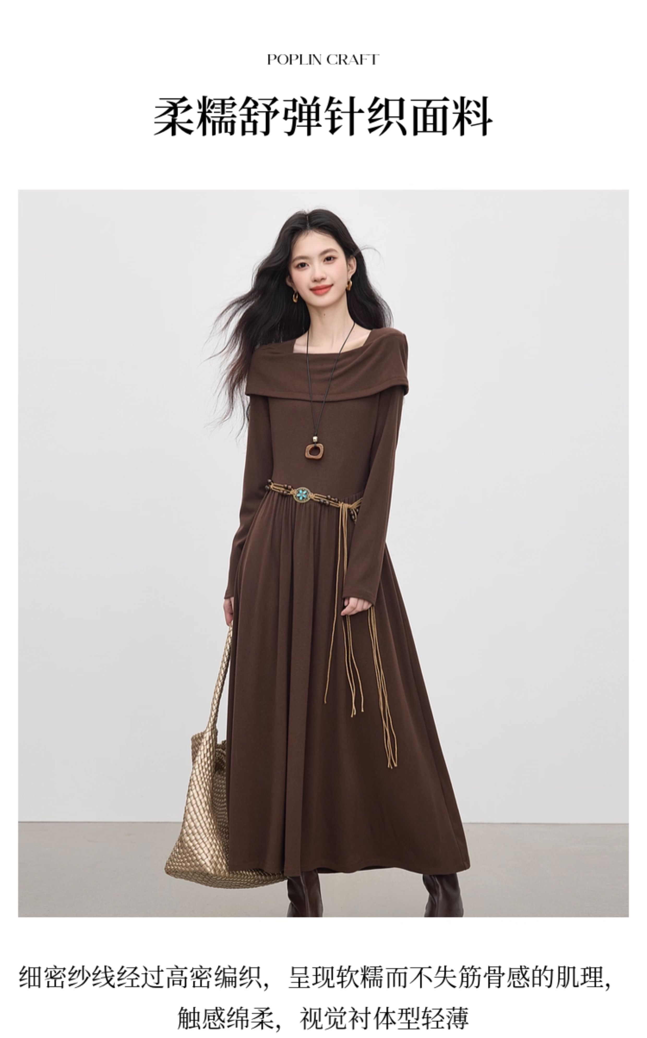 【09/17新品】熙世界可露丽棕色一字领针织连衣裙女2025秋新款复古气质优雅长裙