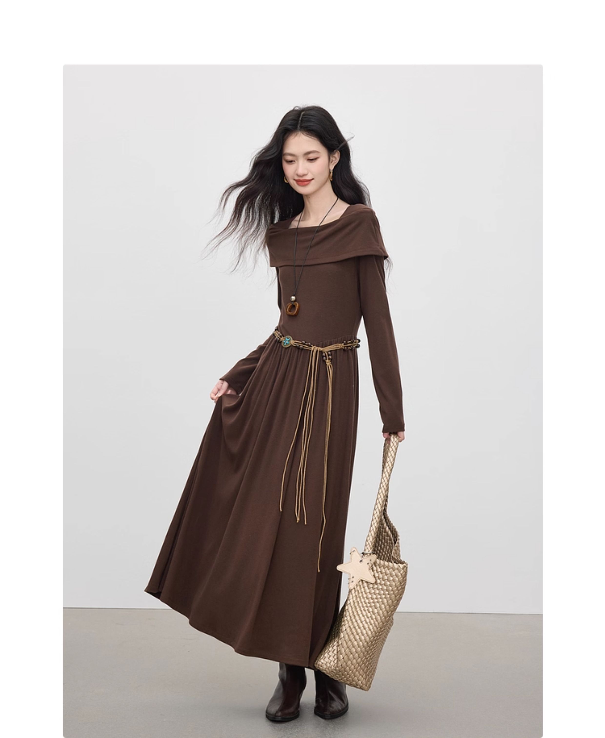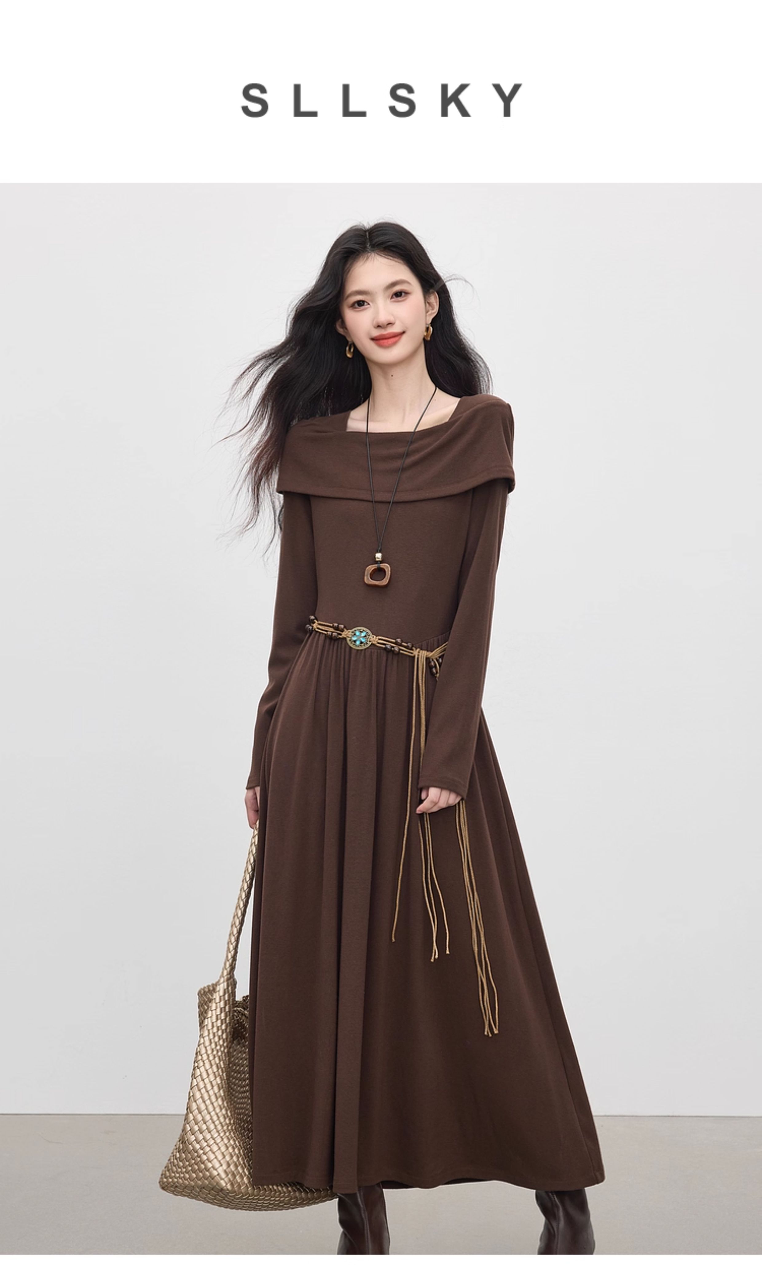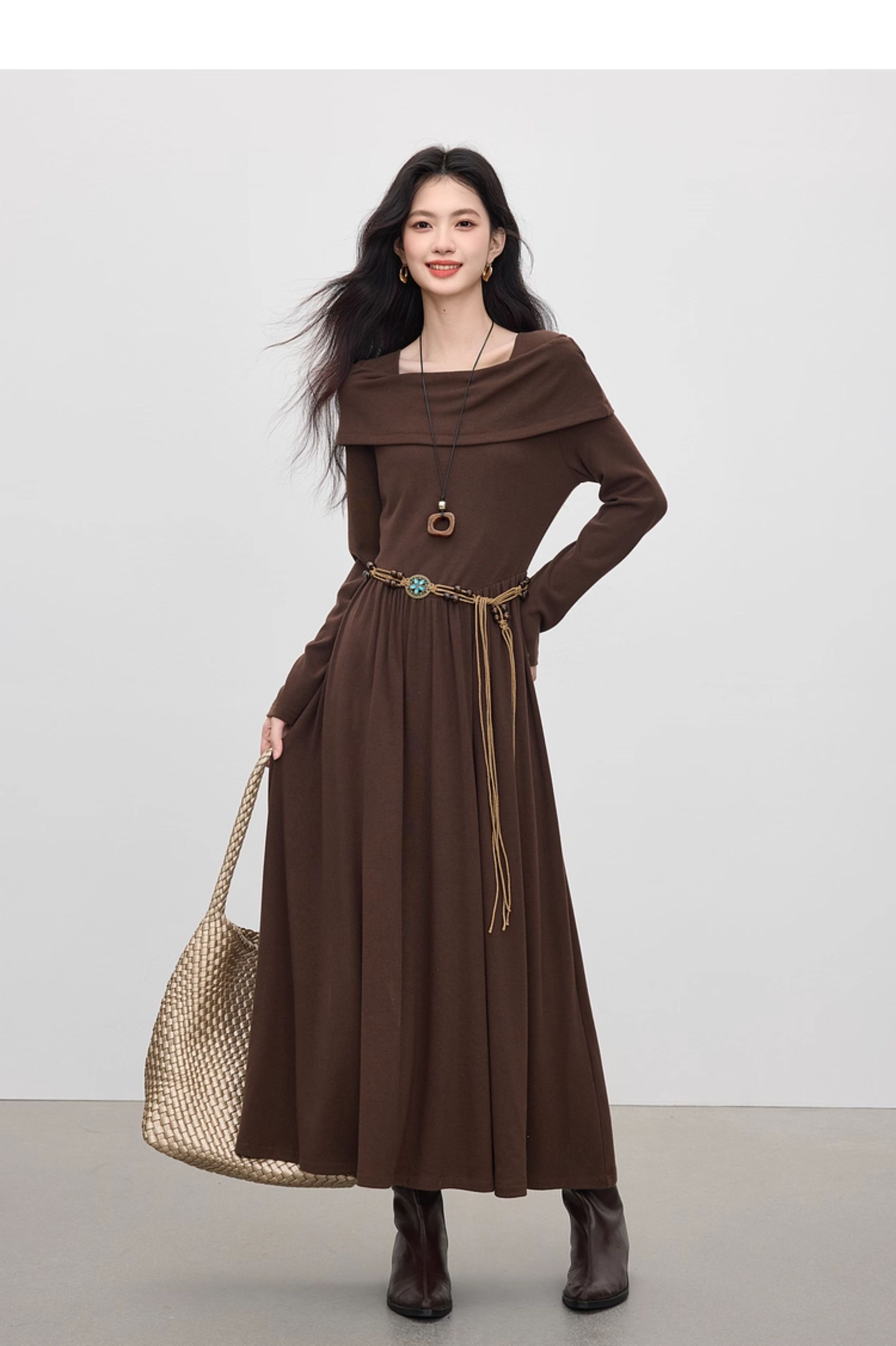 【09/17新品】熙世界可露丽棕色一字领针织连衣裙女2025秋新款复古气质优雅长裙