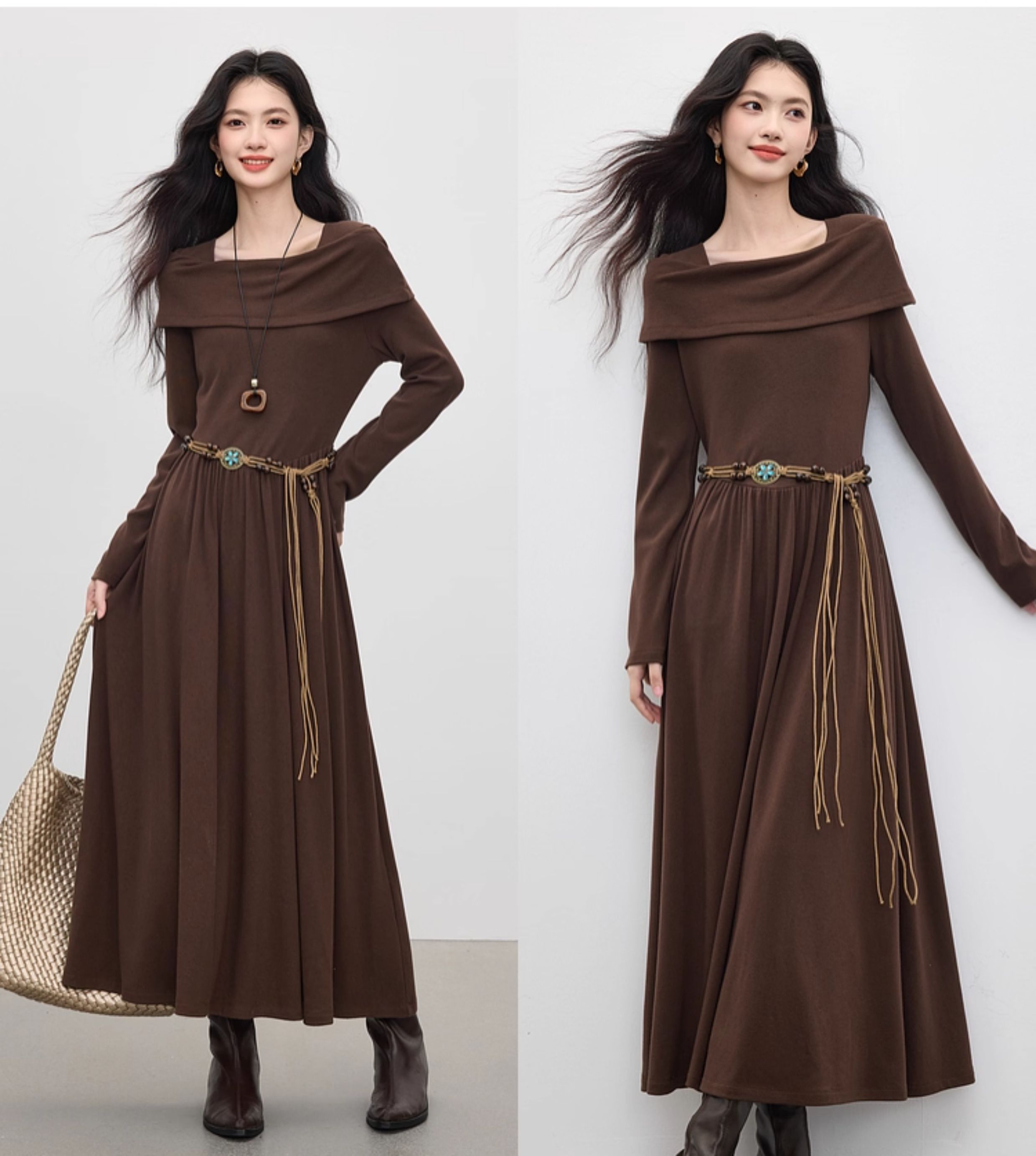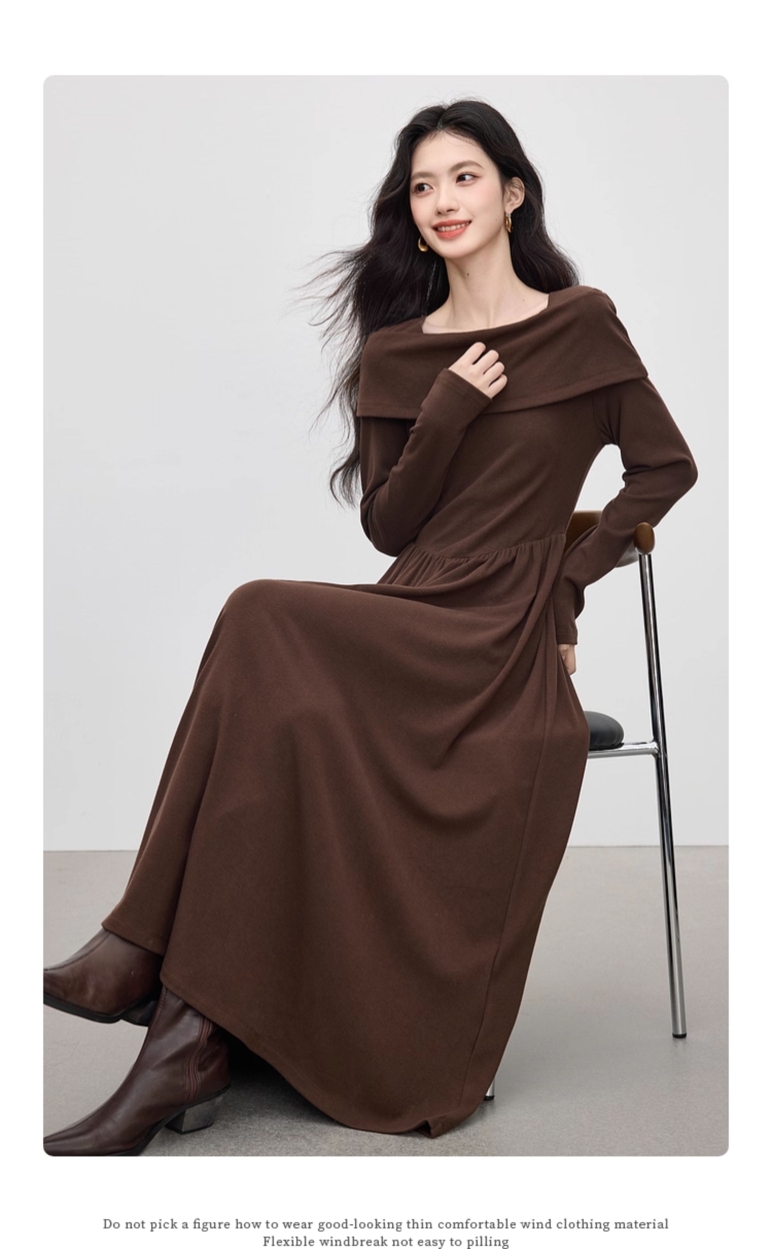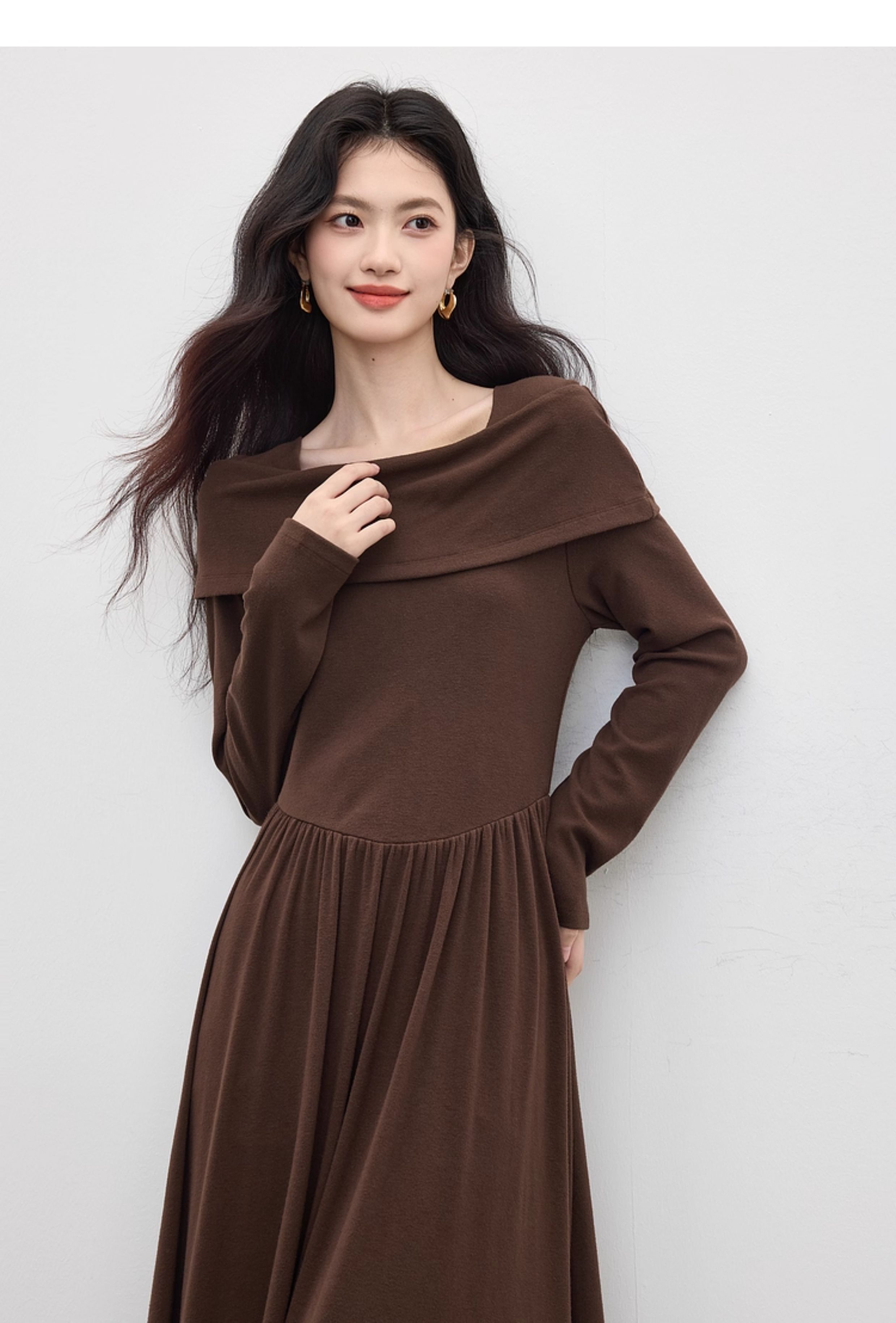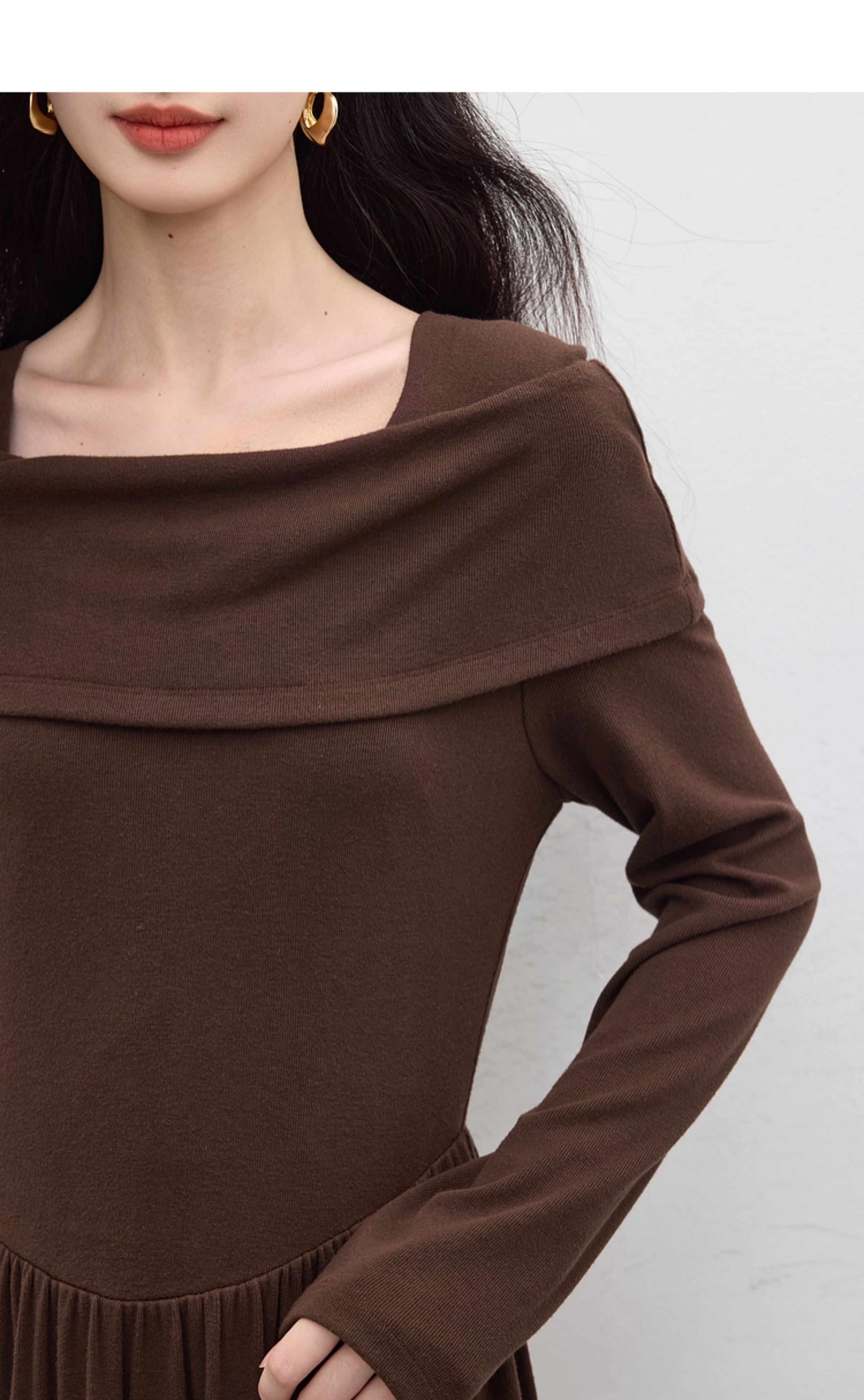 【09/17新品】熙世界可露丽棕色一字领针织连衣裙女2025秋新款复古气质优雅长裙