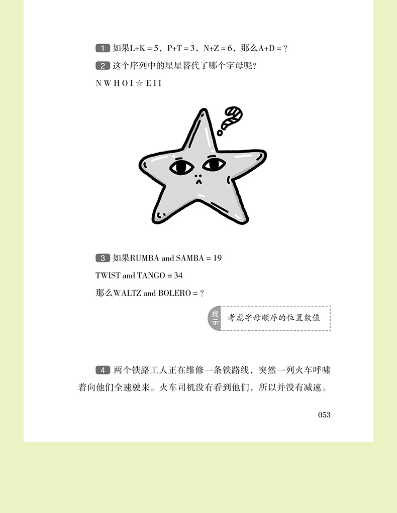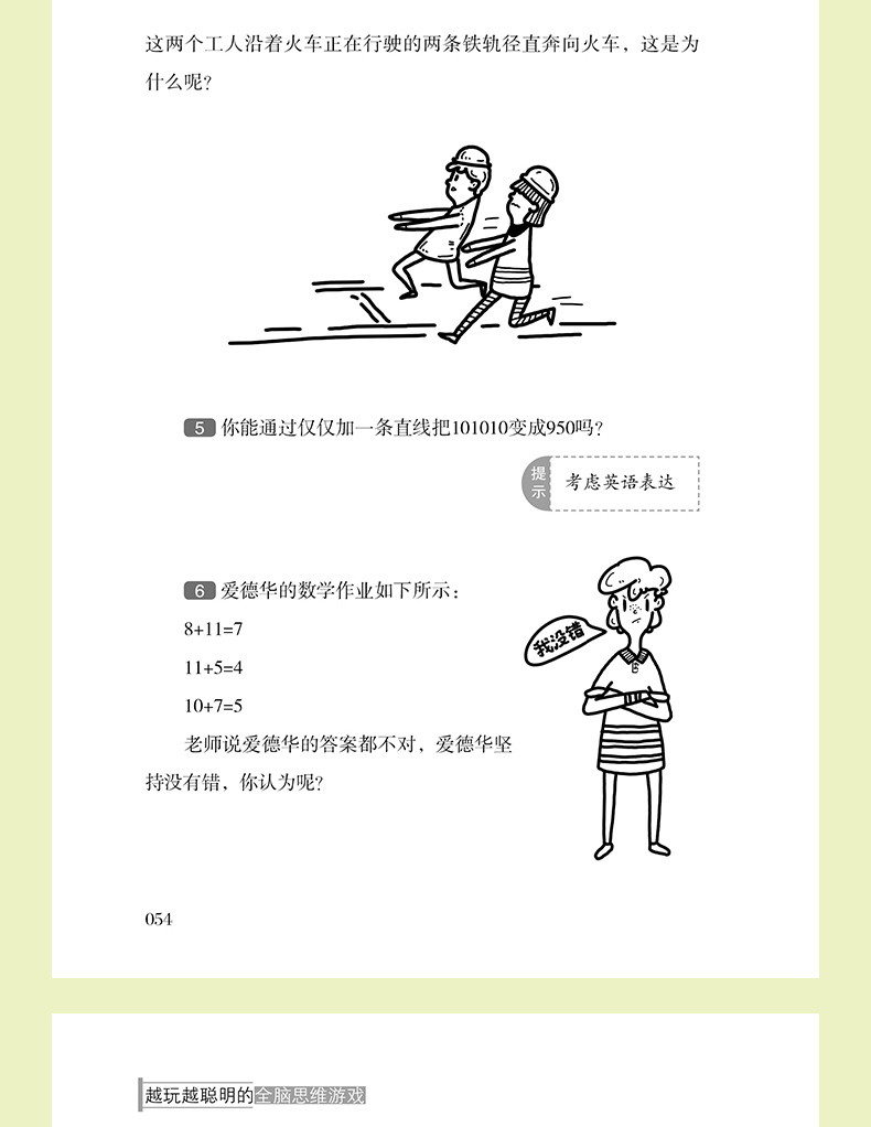 《越玩越聪明的全脑思维游戏》精选300道经典的思维游戏,主要分为4个类别,分别是数字计算、逻辑判断、图形创新、数独推理。其中有看似复杂、转换思维后却发觉常简单的推理题,有让人困惑不解、需要仔细观察的图形难题,有需要逻辑思维和判断力才能搞定的数独游戏等。这些浓缩了思维训练精华的游戏能帮助你快速掌握提高思维能力的有效方法,让你越玩越聪明。