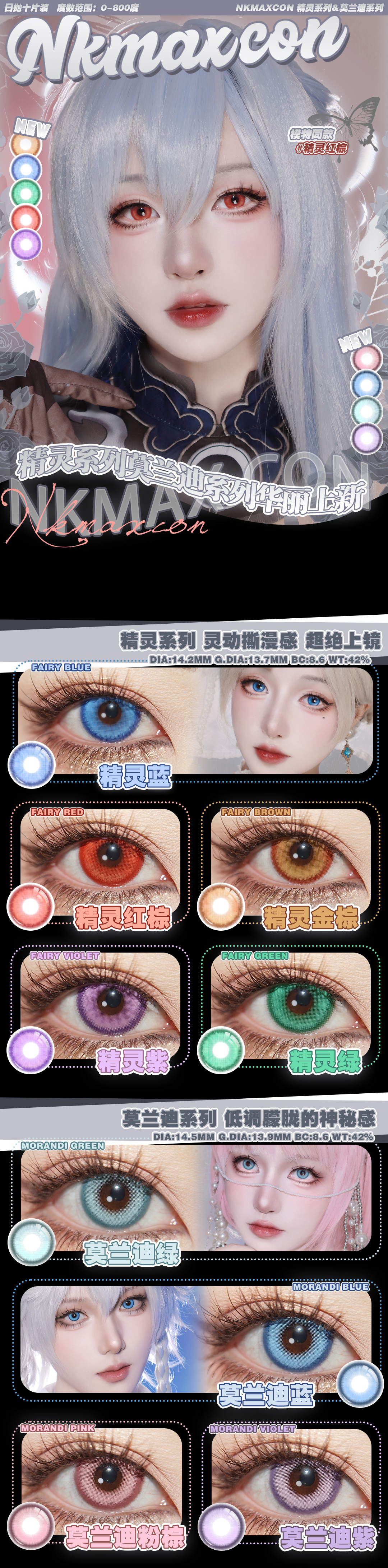 【活动】NKMAXCON 日抛 新品 精灵系列 精灵金棕/红棕/紫/绿/蓝 莫兰迪系列 莫兰迪绿/紫/蓝/粉棕 COS显色推荐 蓝色监狱 玲王/约尔/鲁路修/环状水星/白井黑子 小红书热门美瞳推荐