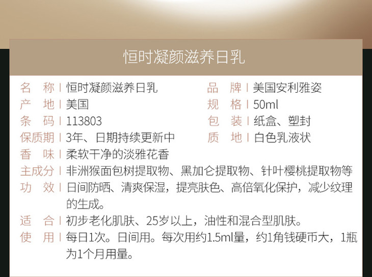 【保税仓】美国安利amway 雅姿恒时凝颜 日间防护乳液50ML