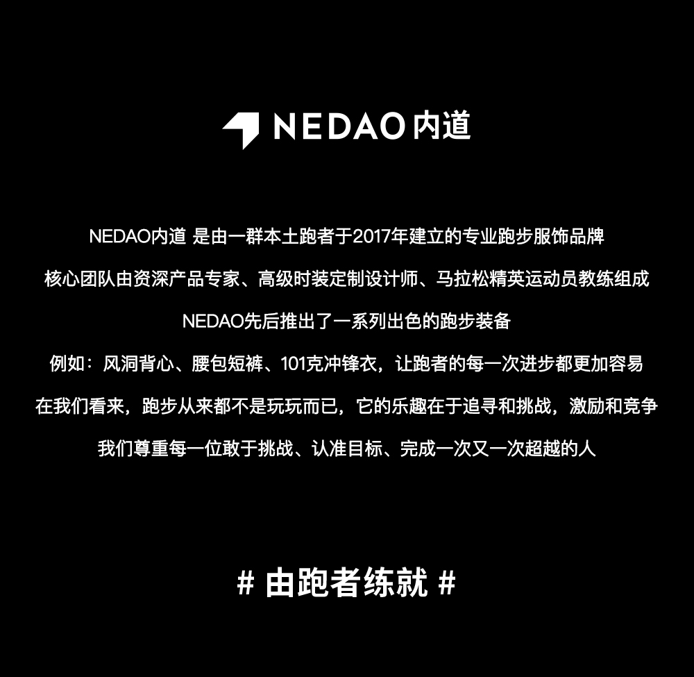 NEDAO脱胎于 GEARLAB(爱燃烧), 是由一群本土跑者建立的专业跑步服饰品牌。 在我们看来,跑步从来都不是玩玩而已。 它的乐趣在于追寻和挑战,激励和竞争。 而内道,属于每一位敢于挑战的跑者。