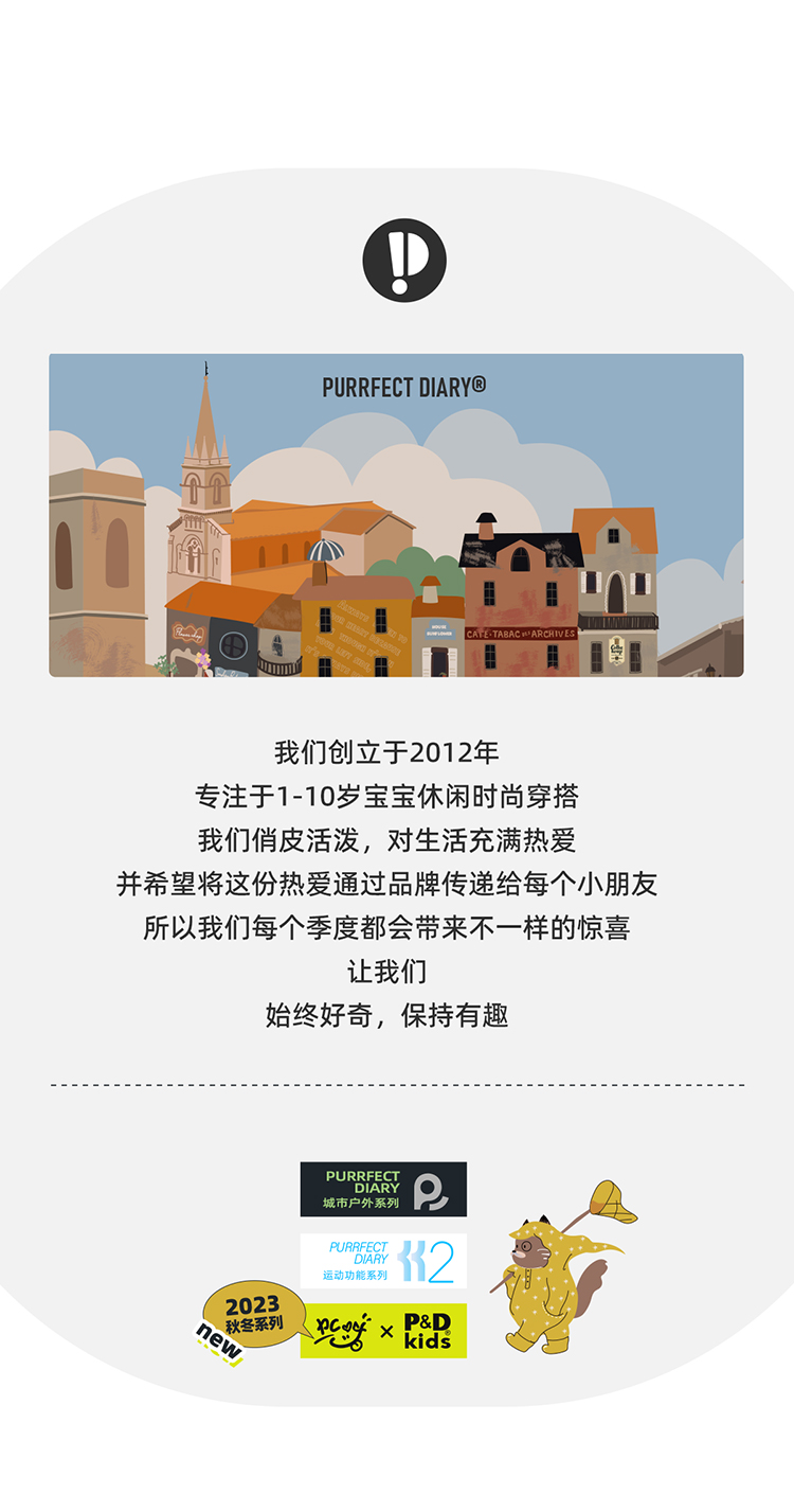 - Purrfect-Diary专注于贴近自然随性的穿着概念,轻奢平价的童装文化传播,在产品设计上更加注重婴童穿着的舒适性、安全性、更出众的国际化品牌,将欧美的育婴文化在中国进行深入的传播与推广。