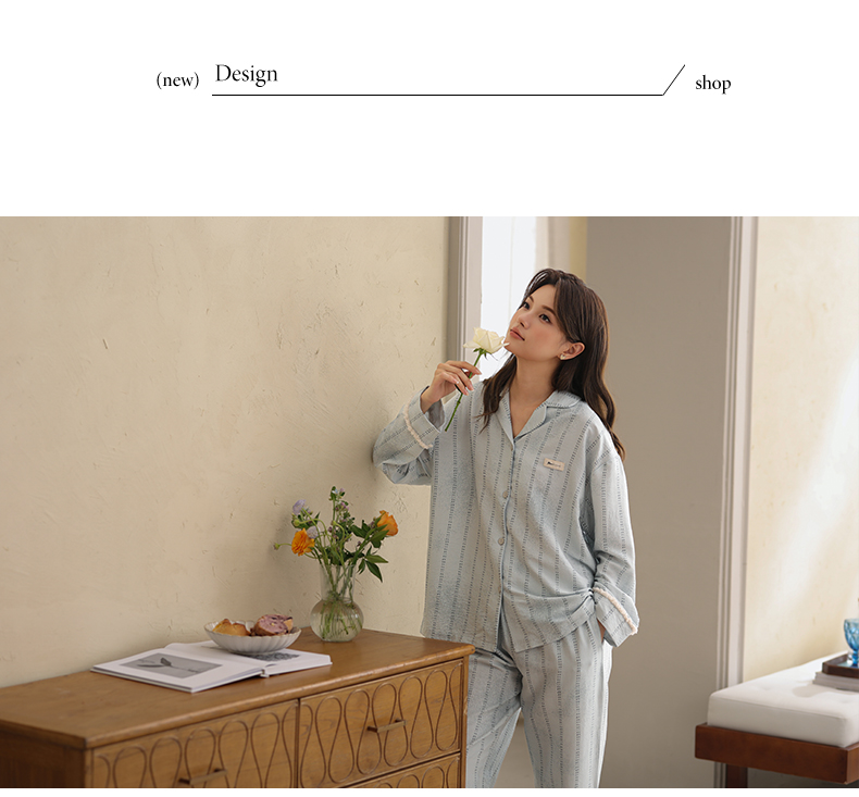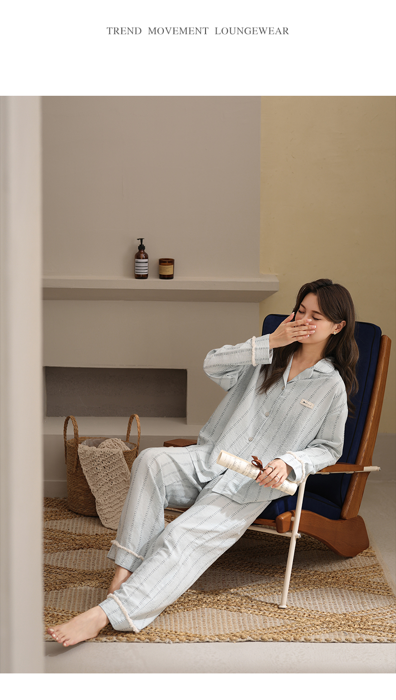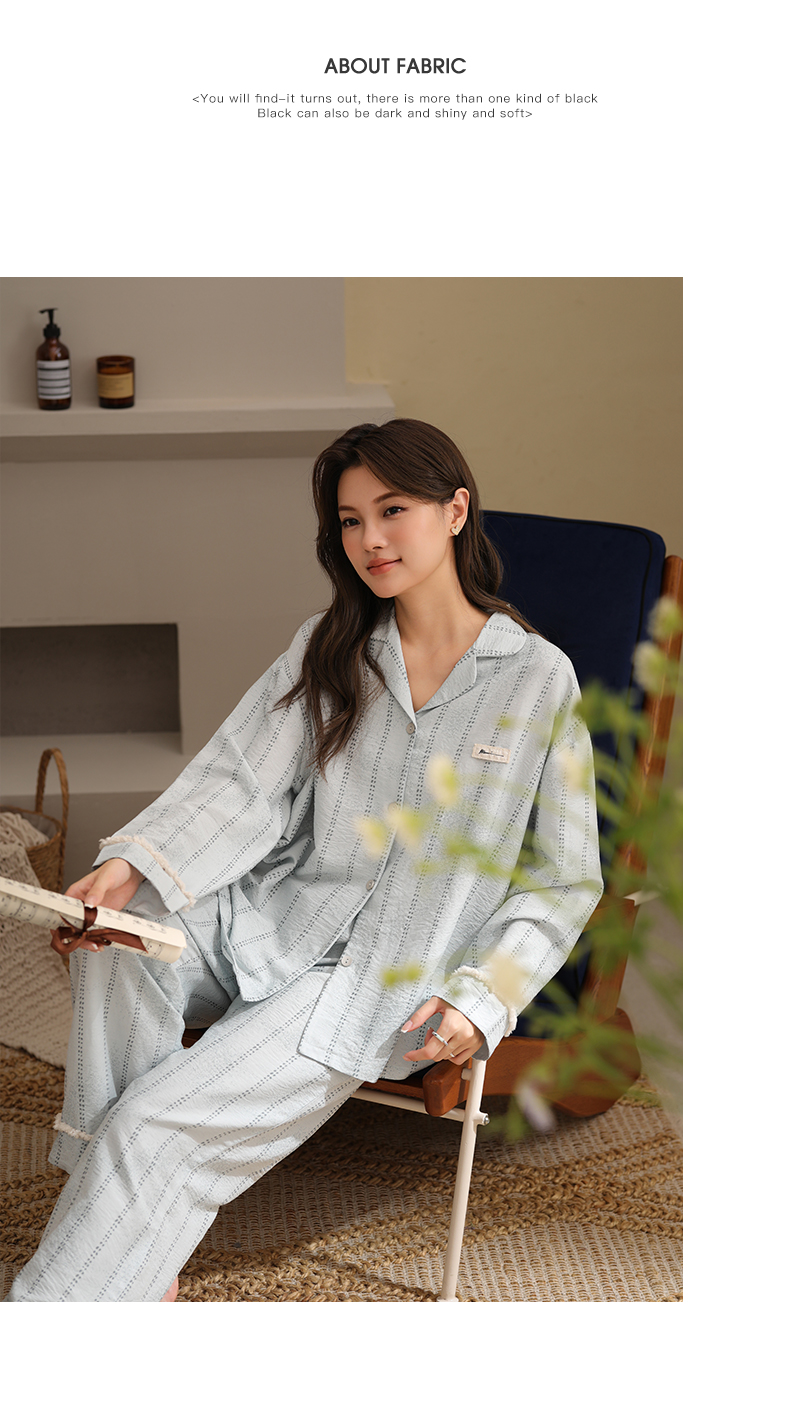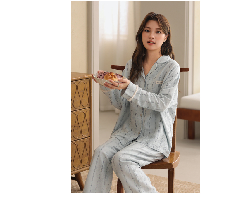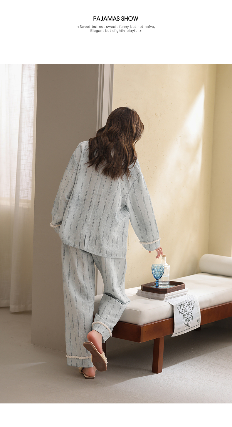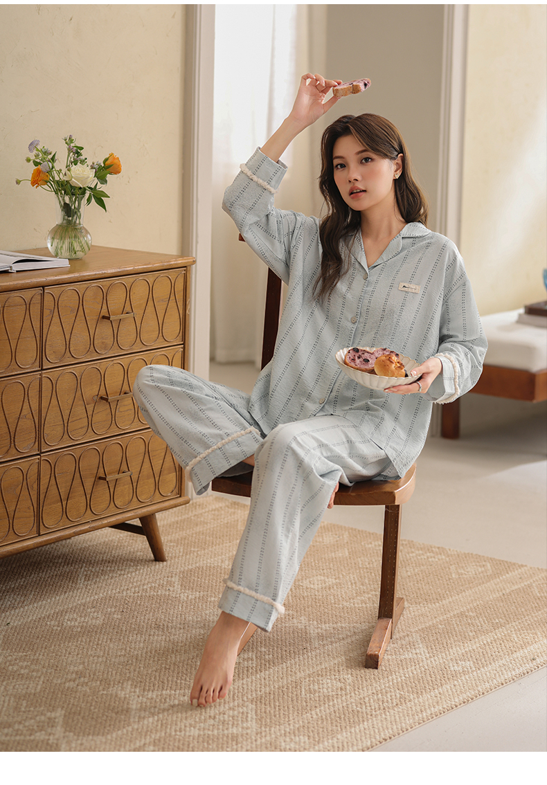 可人儿春秋季带胸垫泡泡绵女士长袖长裤睡衣可外出小众家居服套装