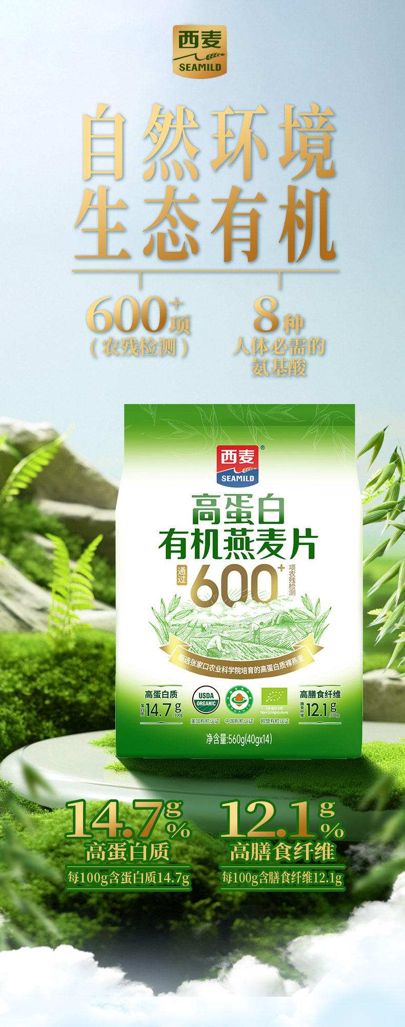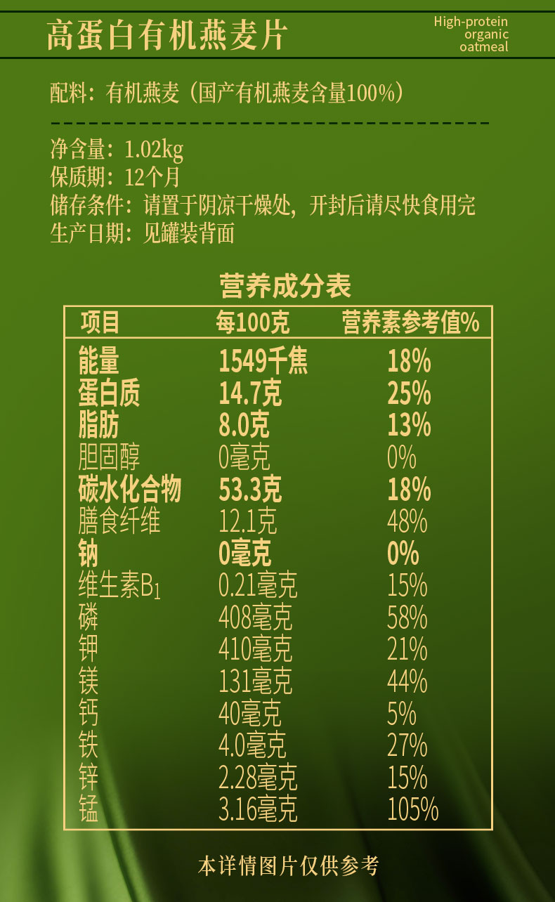 高蛋白有机燕麦片560g 张家口坝上1号燕麦 0蔗糖 即食代餐营养谷物