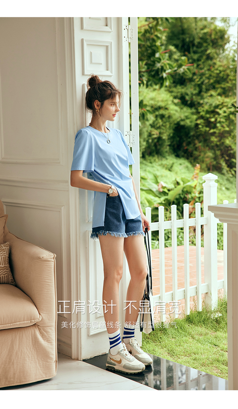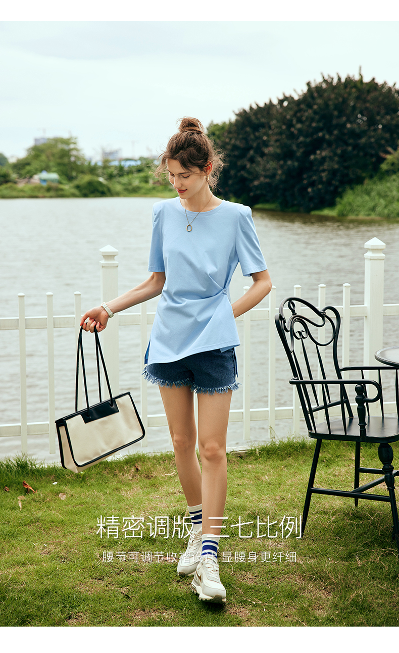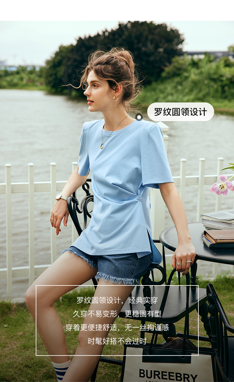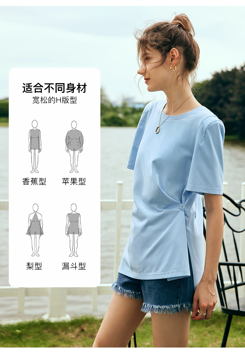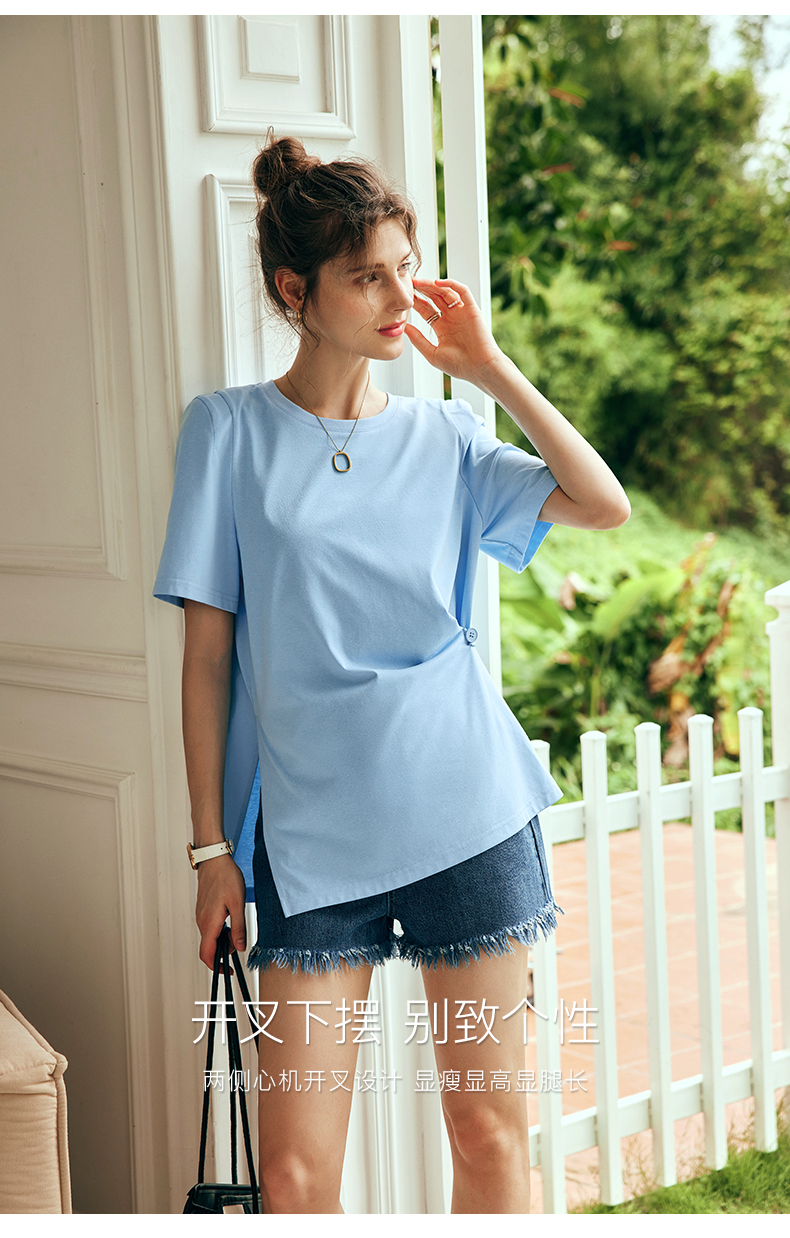 OLrain欧芮儿法式短袖T恤女夏季2023新款宽松不规则开叉休闲上衣