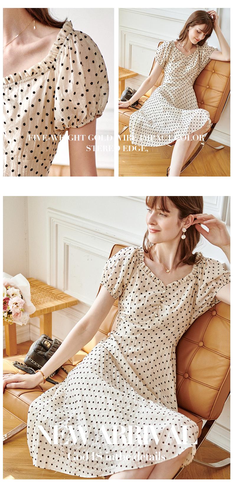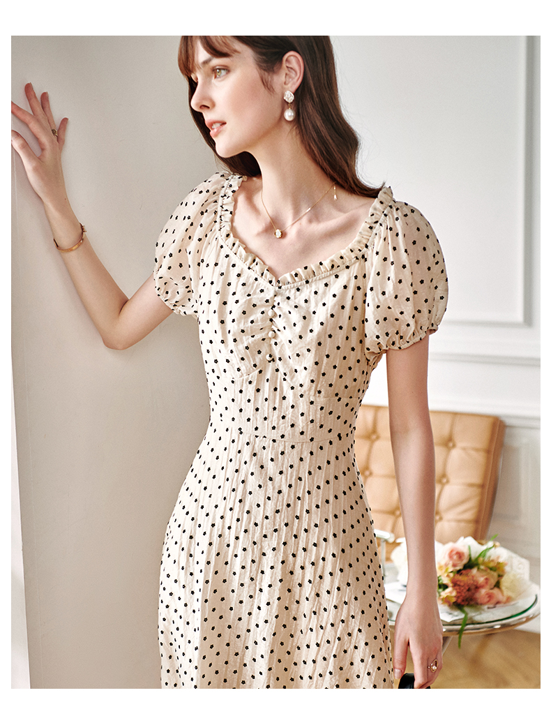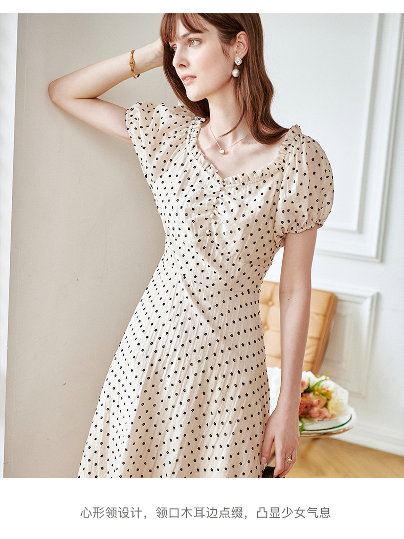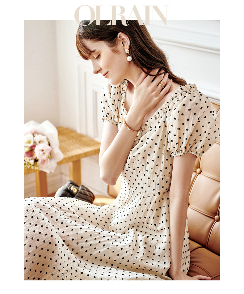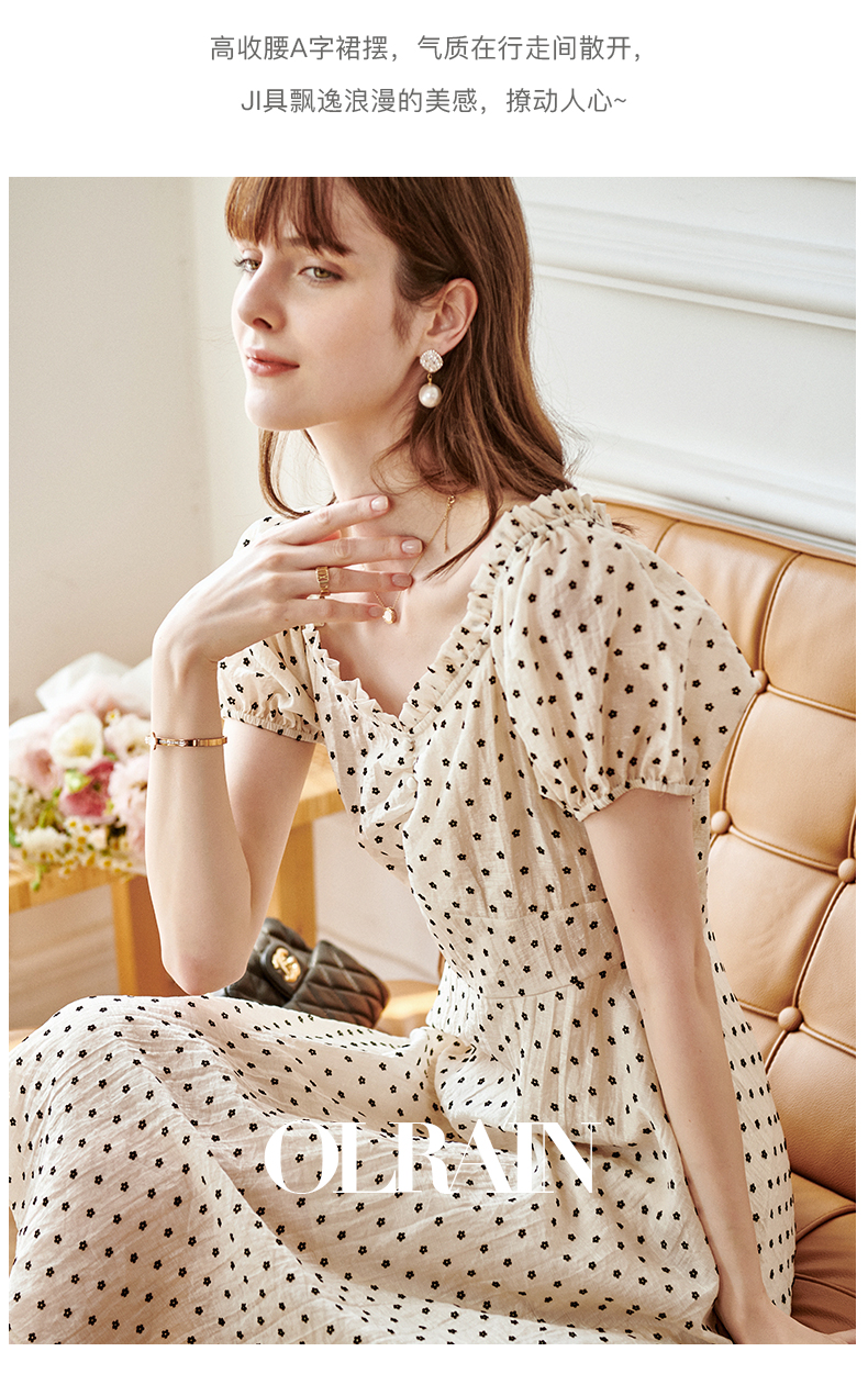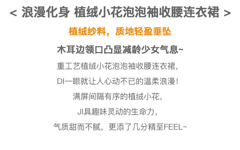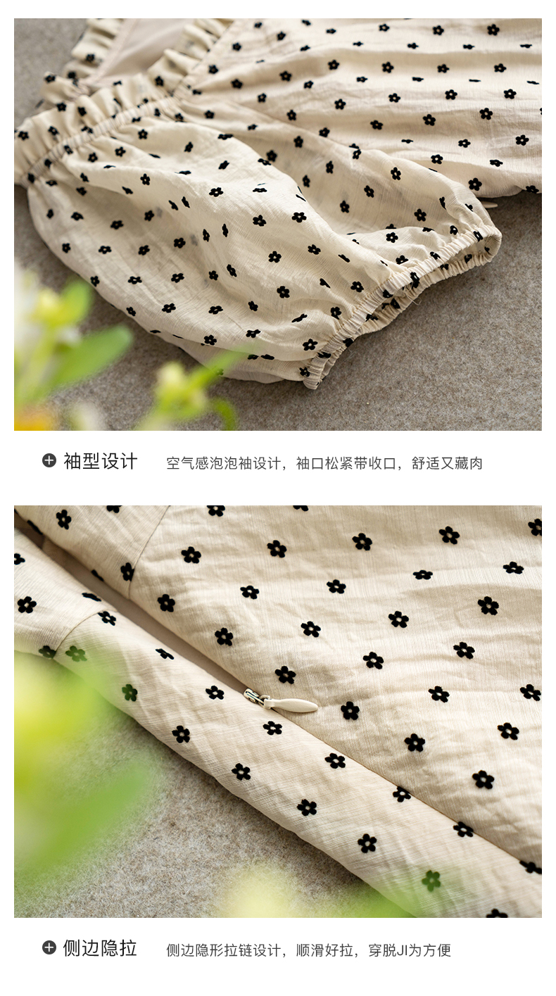 欧芮儿杏色连衣裙新款2021收腰显瘦泡泡袖重工植绒小花法式裙