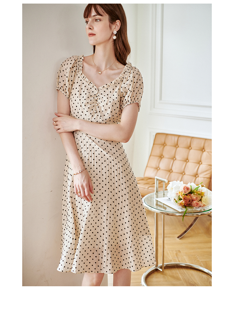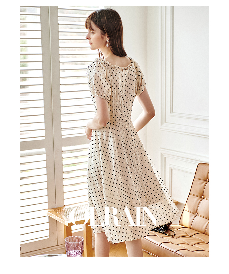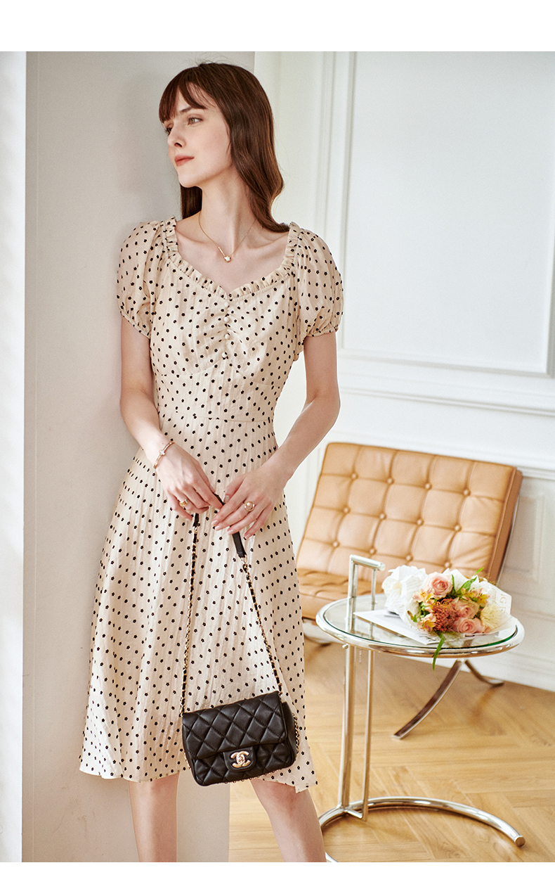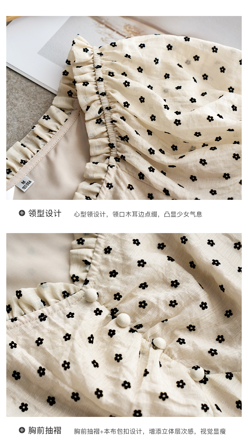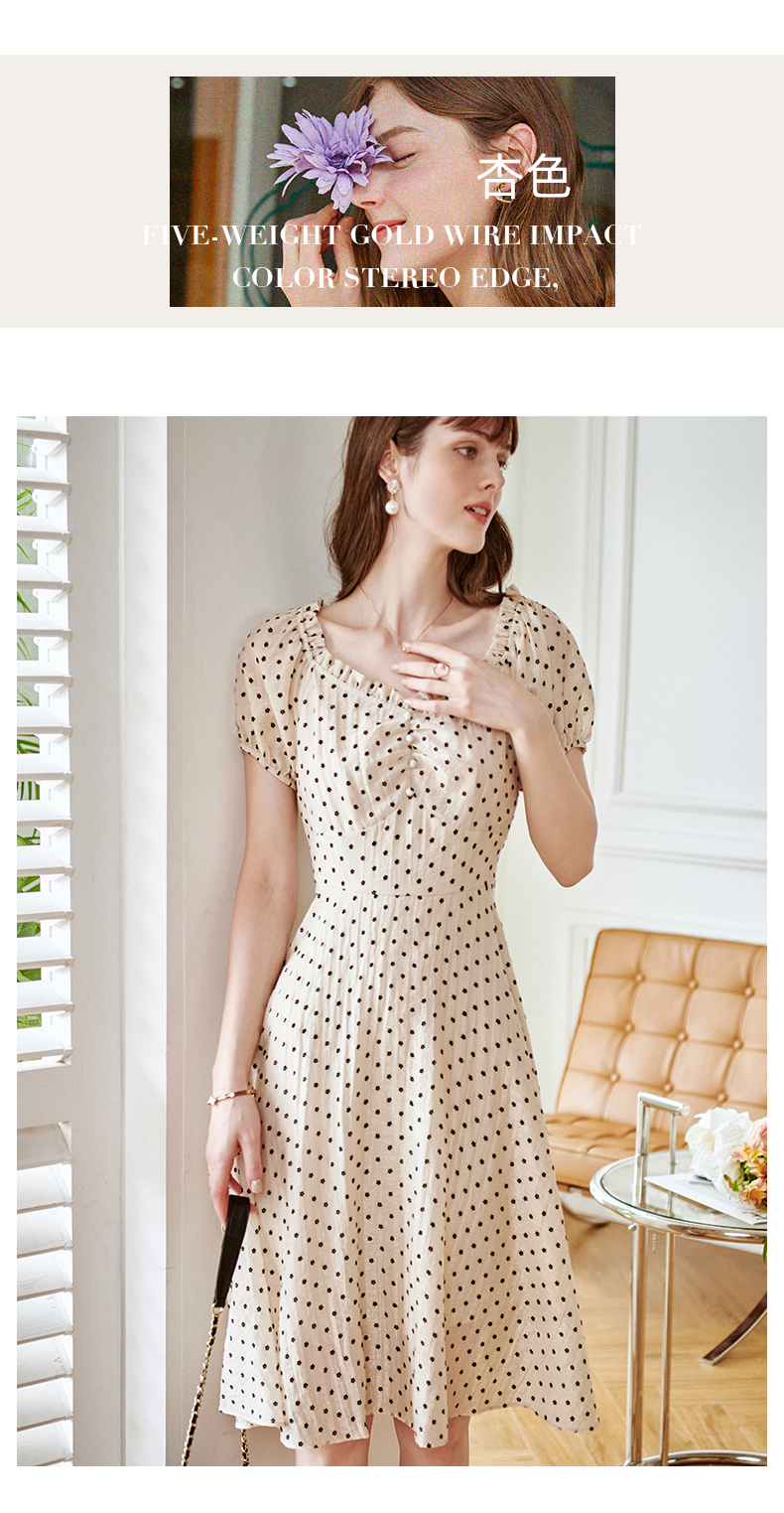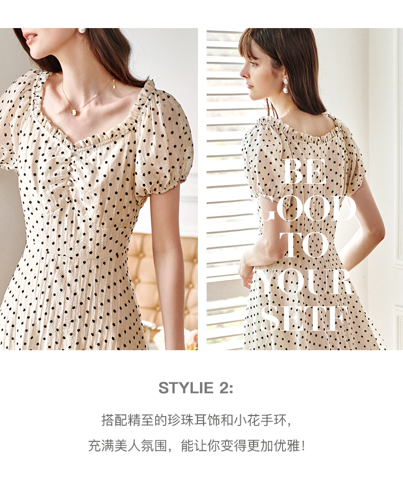 欧芮儿杏色连衣裙新款2021收腰显瘦泡泡袖重工植绒小花法式裙