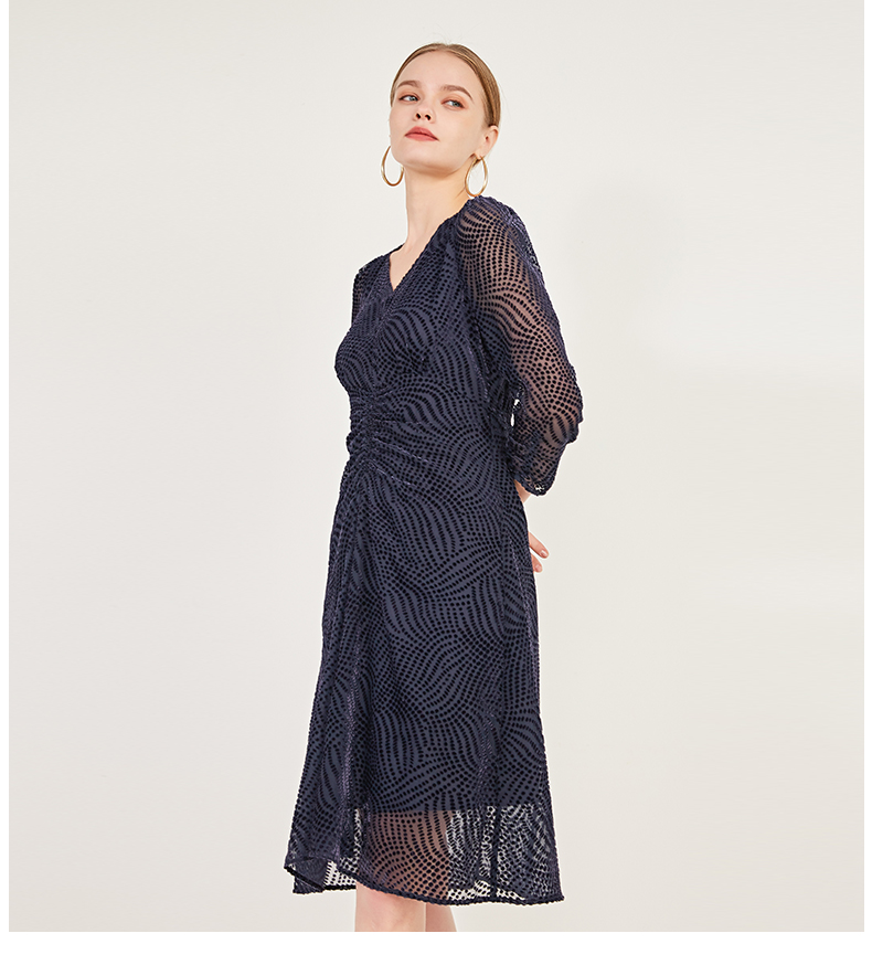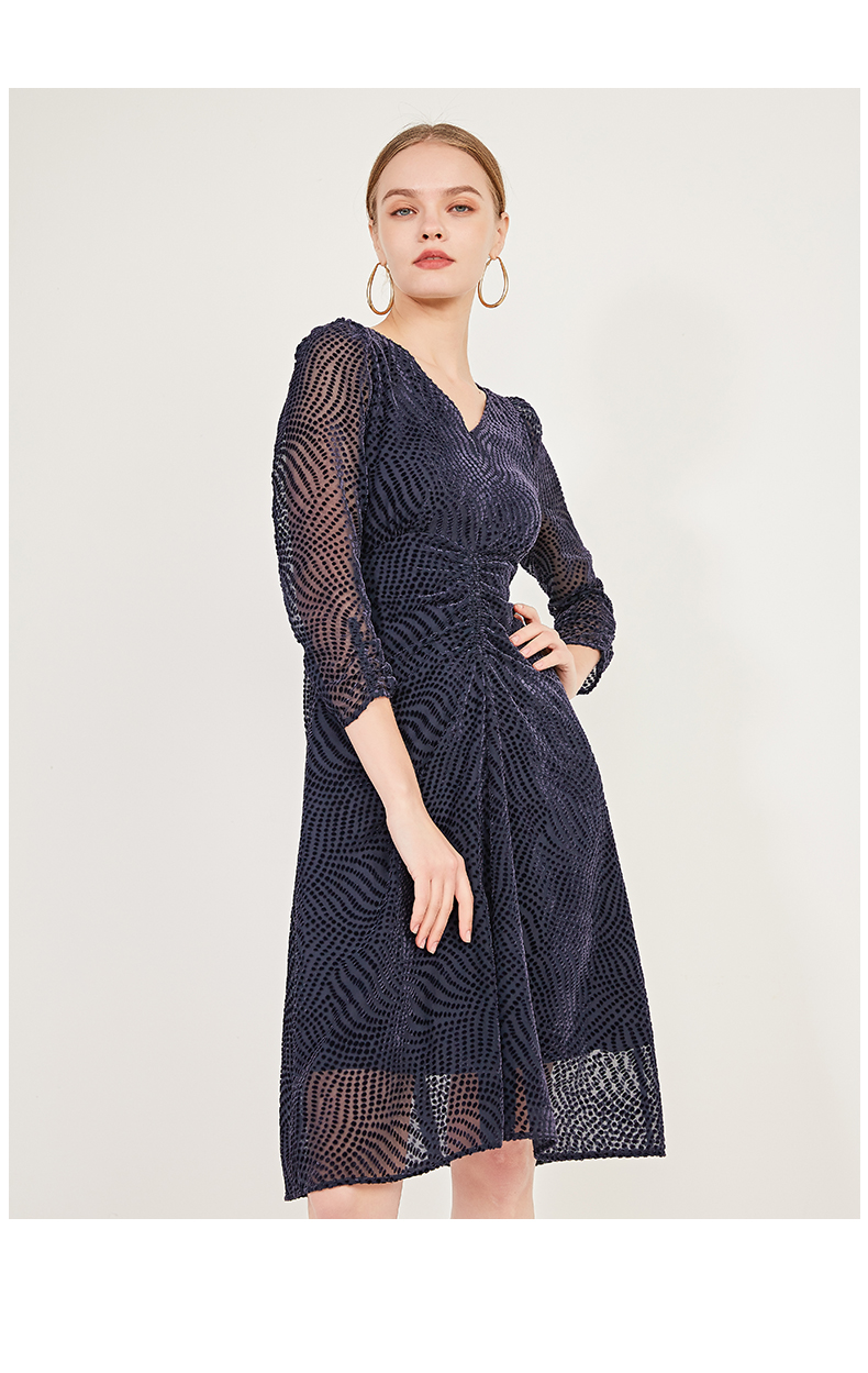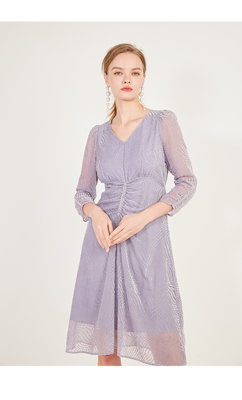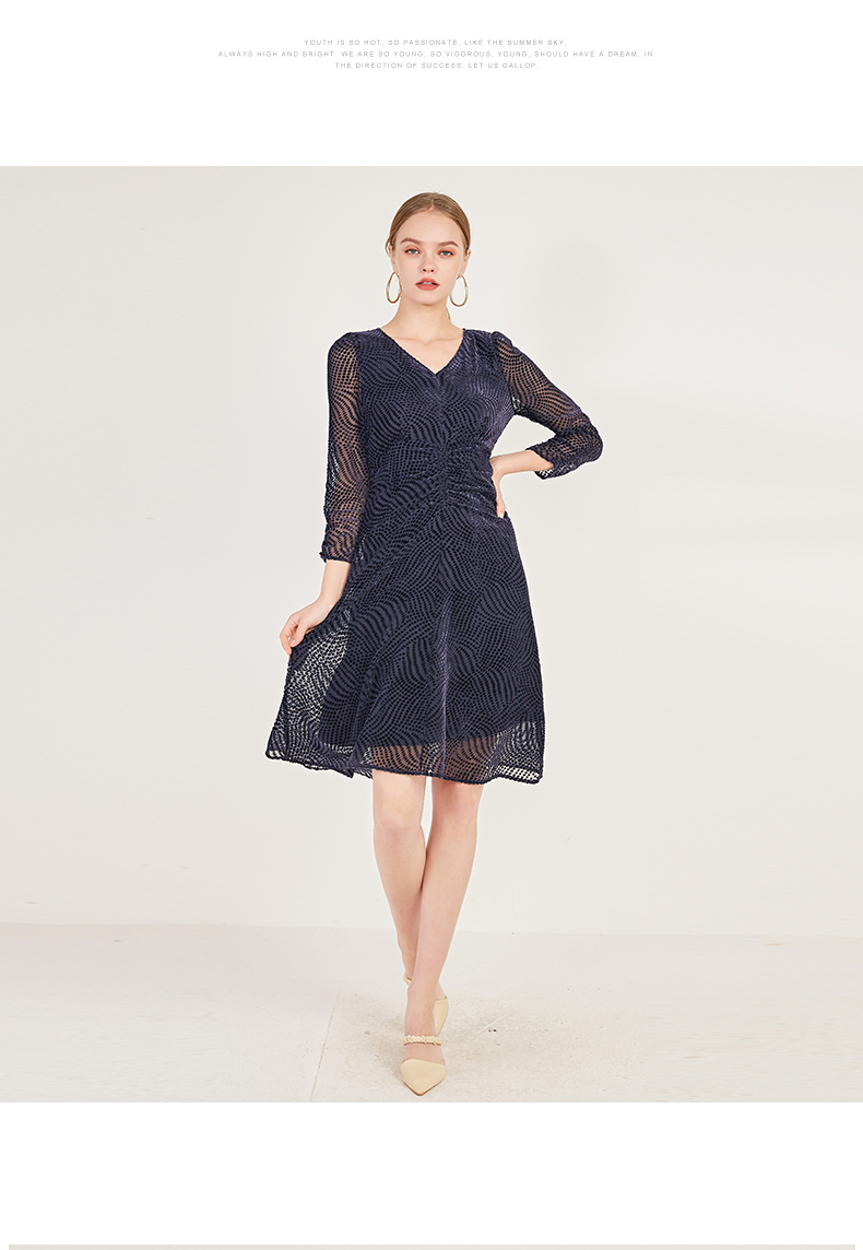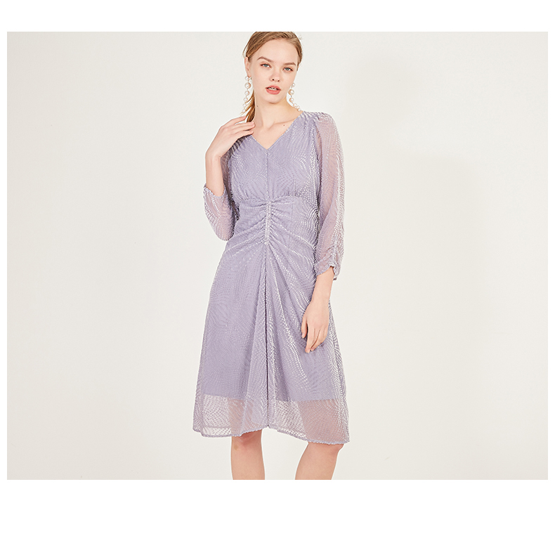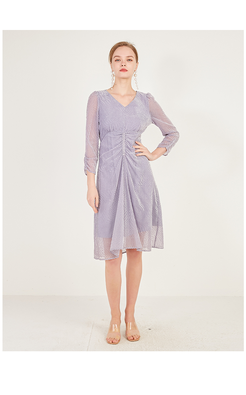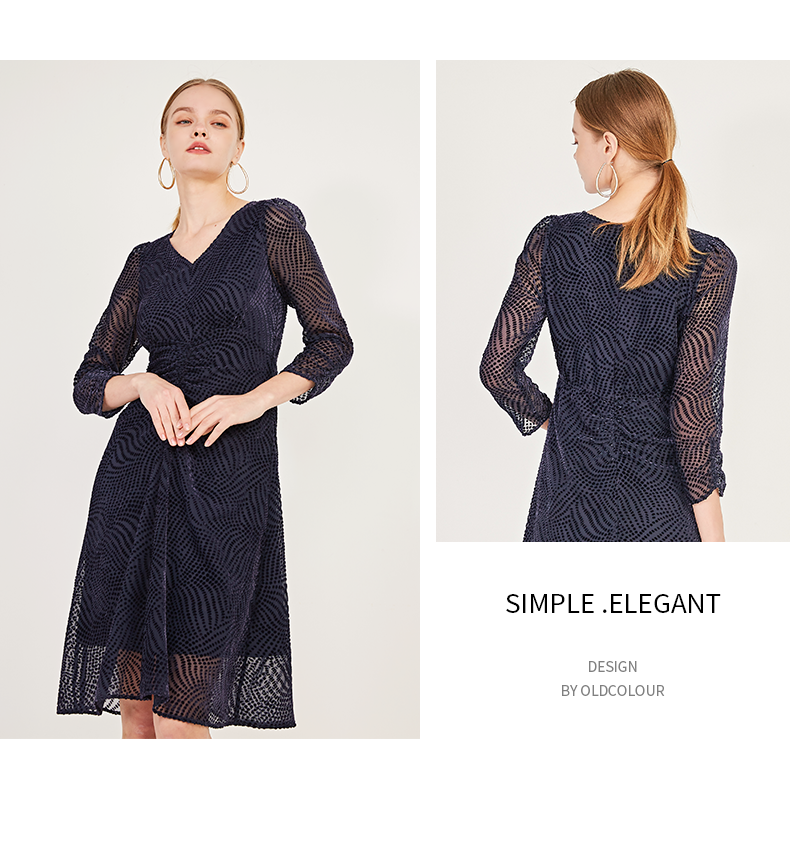 oldcolour春季女人气质抽绳修身收腰V领中长款连衣裙N12103273