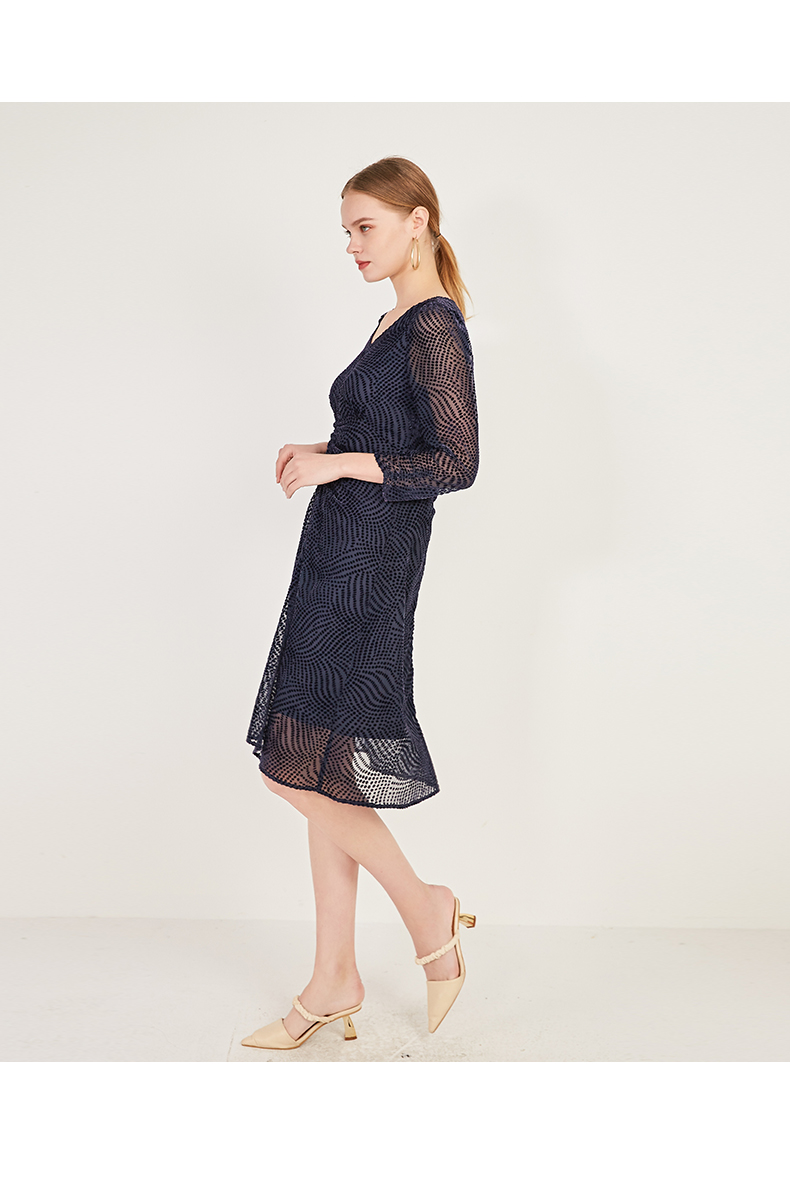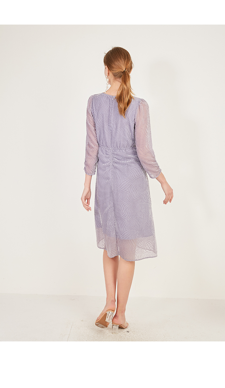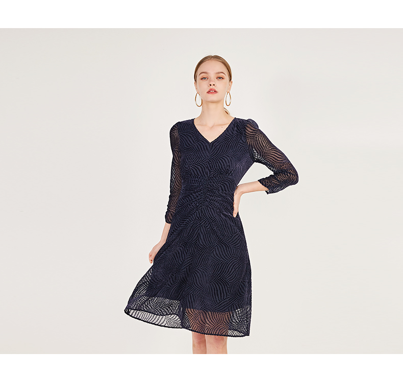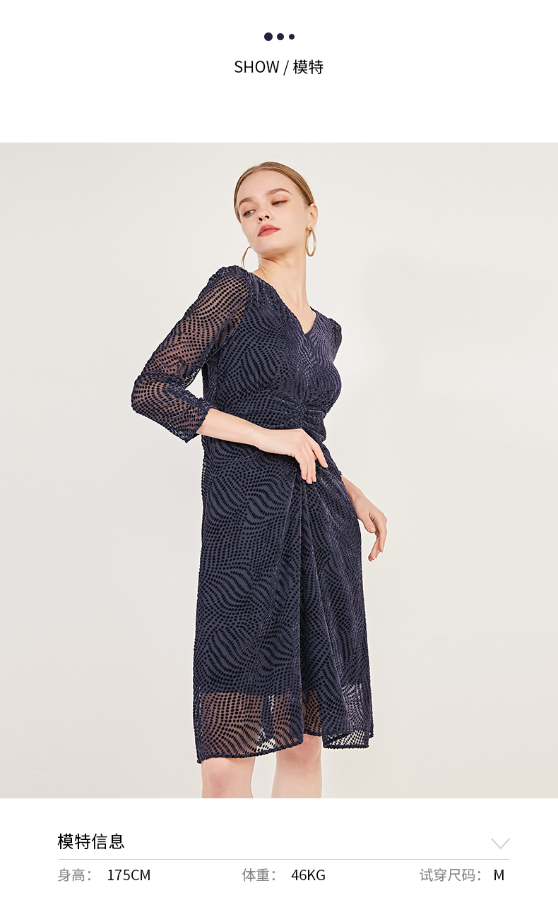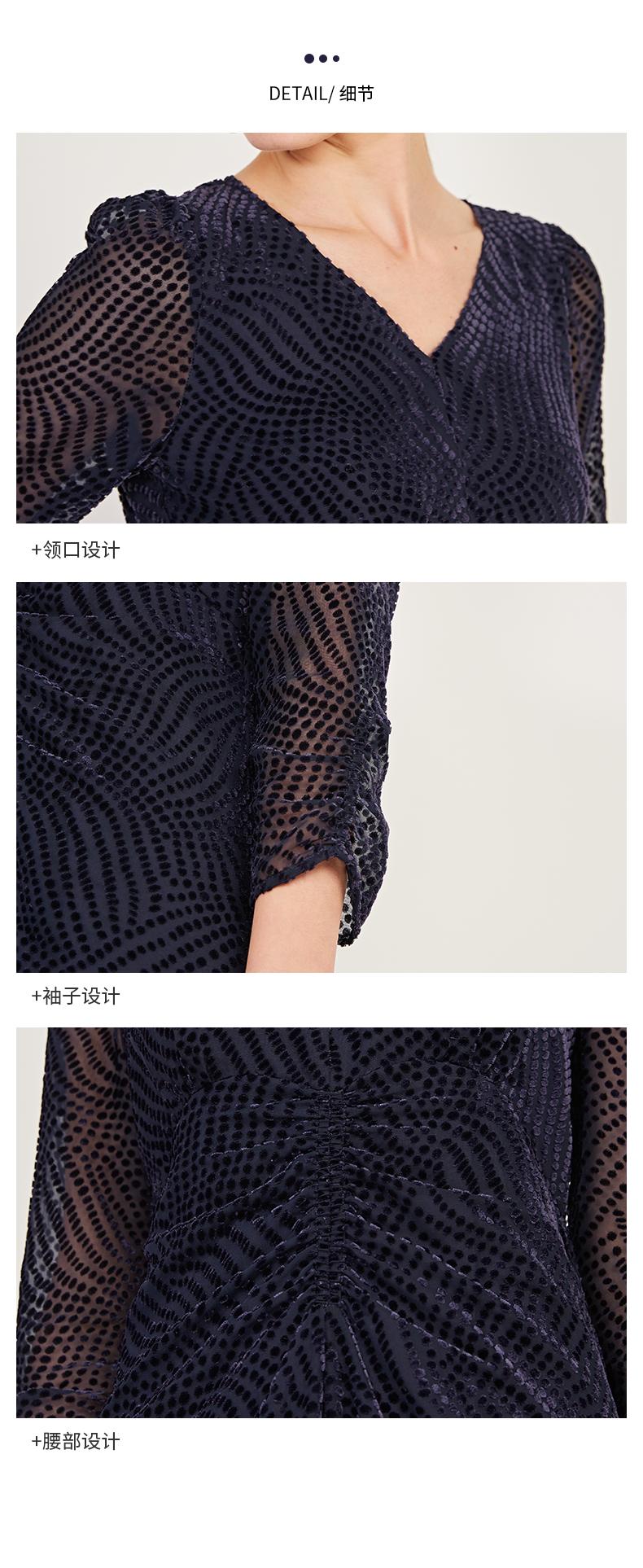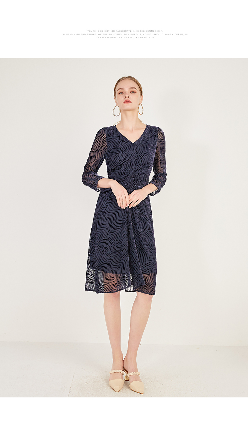 oldcolour春季女人气质抽绳修身收腰V领中长款连衣裙N12103273