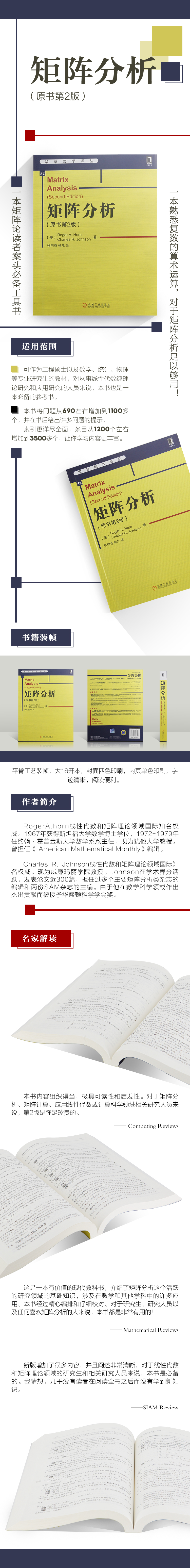 《华章数学译丛:矩阵分析(原书第2版》从数学分析的角度阐述了矩阵分析的经典和现代方法,主要内容有特征值、特征向量、范数、相似性、酉相似、三角分解、极分解、正定矩阵、非负矩阵等。新版全面修订和更新,增加了奇异值、CS分解和Weyr标准范数等相关的小节,扩展了与逆矩阵和矩阵块相关的内容,对基础线性代数和矩阵理论作了全面总结,有1100多个问题,并给出一些问题的提示,还有很详细的索引。《华章数学译丛:矩阵分析(原书第2版》可作为工程硕士以及数学、统计、物理等专业研究生的教材,对从事线性代数纯理论研究和应用研究的人员来说,本书也是一本必备的参考书。
