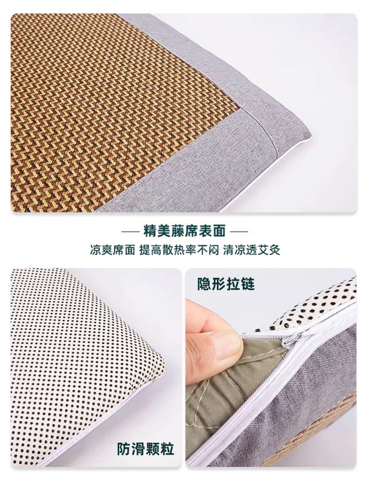 艾绒凉席坐垫 编织藤席,光滑无毛刺,温炙不闷热;棉麻布料,陈年艾绒,底部颗粒防滑,隐形拉链