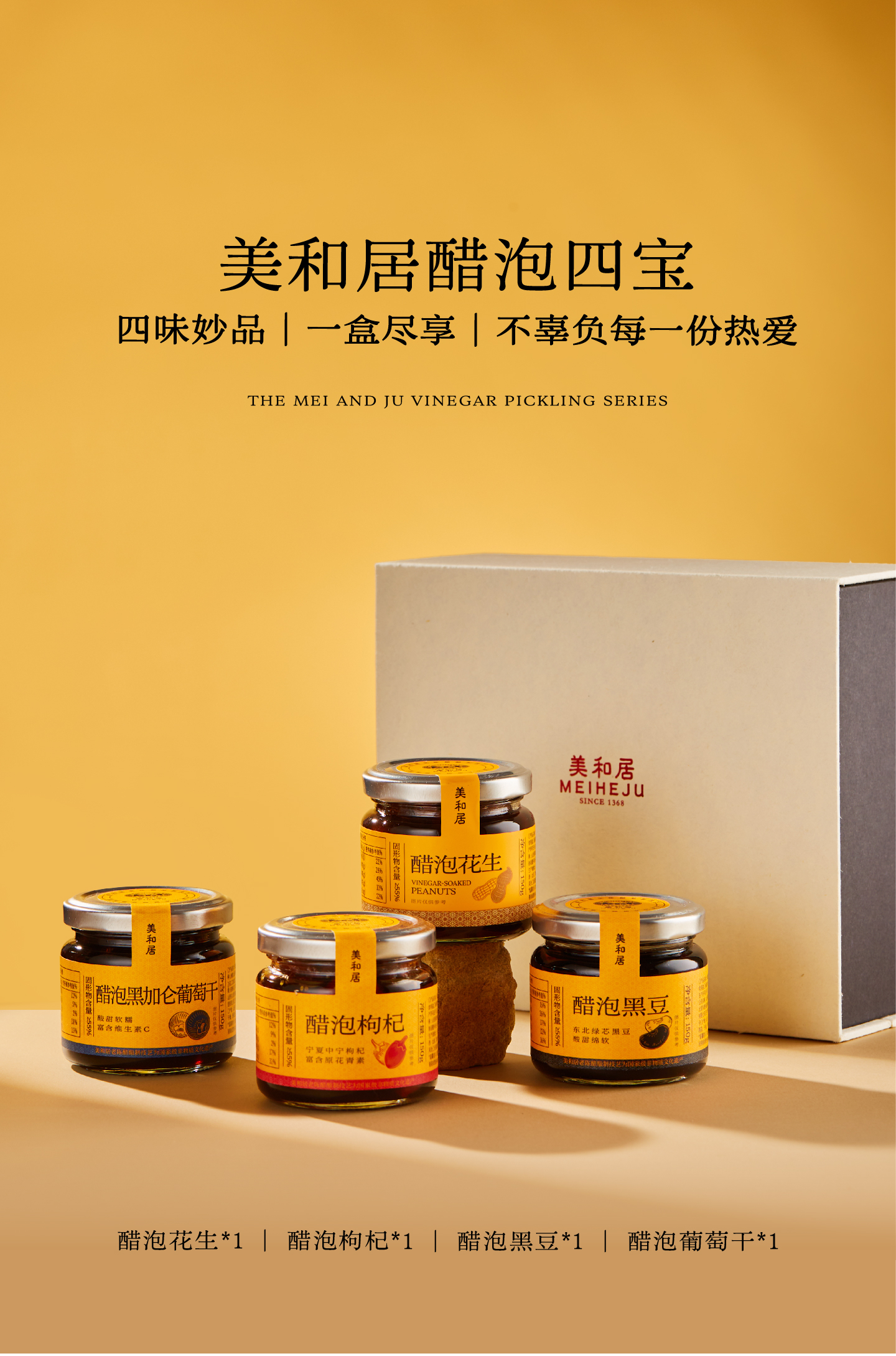 六年老醋泡制的醋泡四宝礼盒 醋泡花生/枸杞/黑豆/葡萄干 150g*4瓶【开封后不支持七天无理由退换,外包装为一次性包装耗材需扣除费用】【新旧包装随机发】