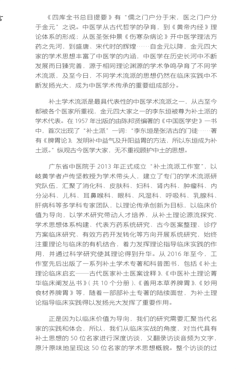 “补土派”是中医学术流派中的一个分支,在学术历史的源流中占有重要的地位。从古至今,从中土论治疾病的思想、理念一直被广大医家重视,补土理论学说并非局限于消化科,在内外妇儿等领域均有着广泛的应用和极高的学术价值。本书共访谈专家五十人,其中国医大师3人,国家级名中医5人,省级名中医10人,还包括全国老中医药专家学术经验继承工作指导老师、国家级学术流派传承工作室负责人等名家。分别从各自的地域、学科、诊疗理念、家传师传心法等角度阐释补土思想的内涵。以一问一答形式,由专家将其诊疗经验娓娓道来,这些实战中的点滴经验,将为中医临床工作者提供点拨和指导。