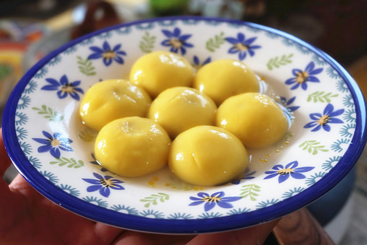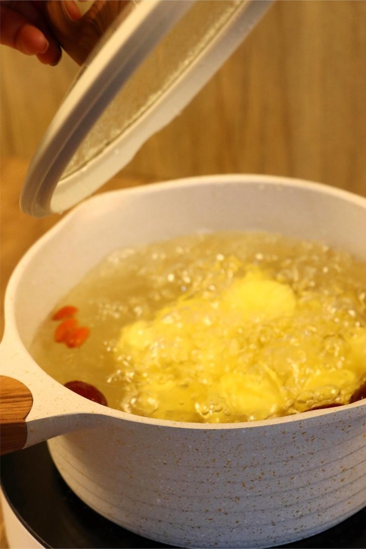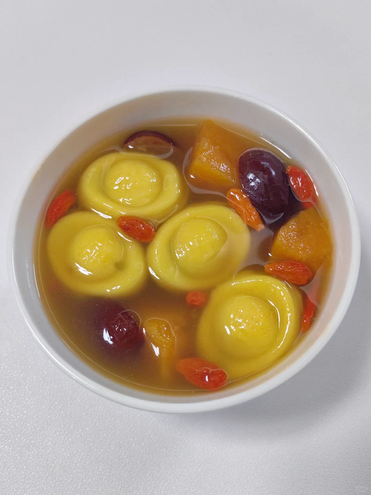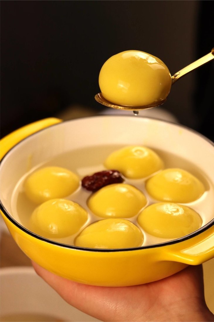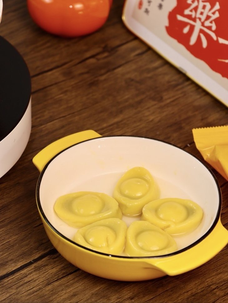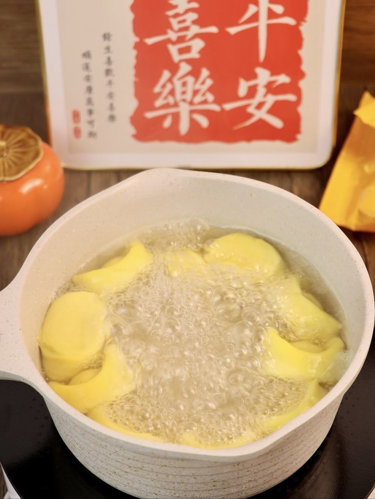 煮熟后锅里翻滚起一个个黄色圆滚滚糯叽叽的小元宝 可爱又喜庆 卖相