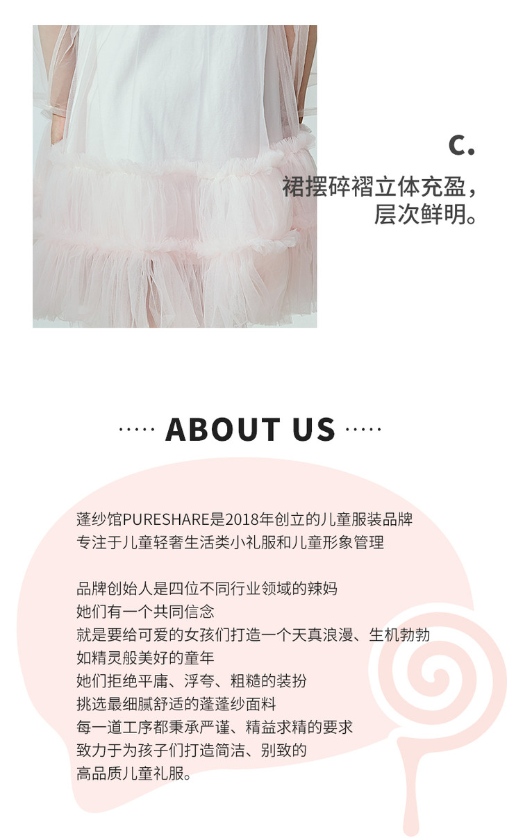 - PureShare蓬纱馆,2018年创立的儿童服装品牌,专注于儿童轻奢生活类小礼服,主张“让孩子做最独特的自己”的品牌理念,为孩子们提供时尚简洁、优雅而又不失童真的生活类礼服。
