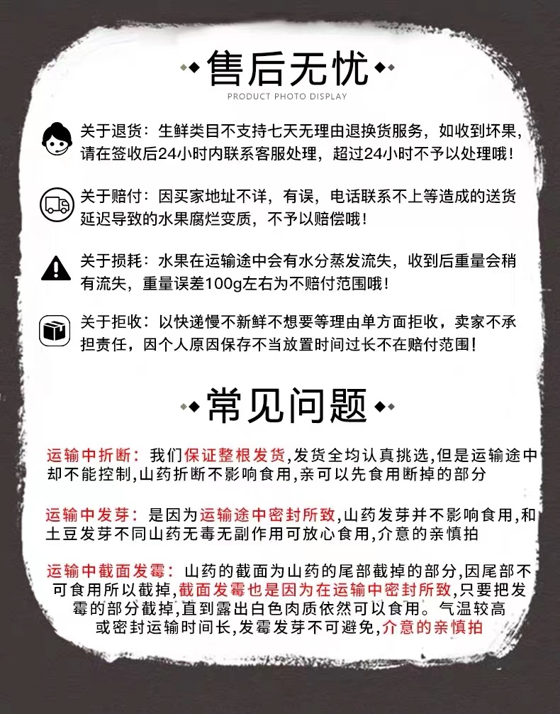 收到货后请立即开箱,去掉或者打开山药的所有包装进行检查,如有腐烂,变质不能食用的请在收到24小时内拍图联系客服。新鲜农产品签收超过24小时无售后的哦