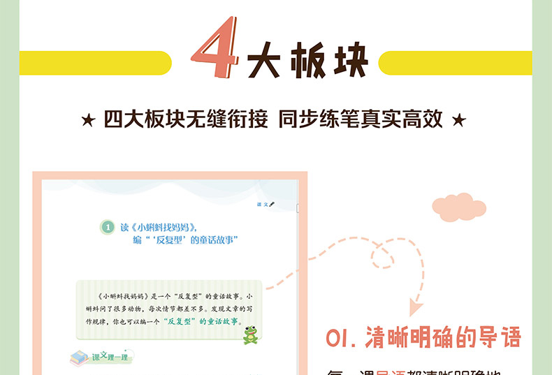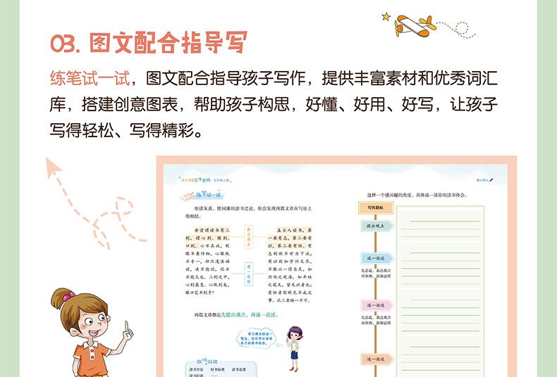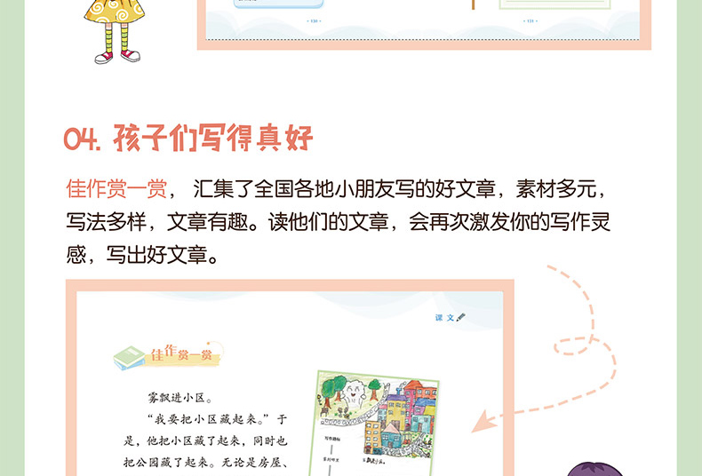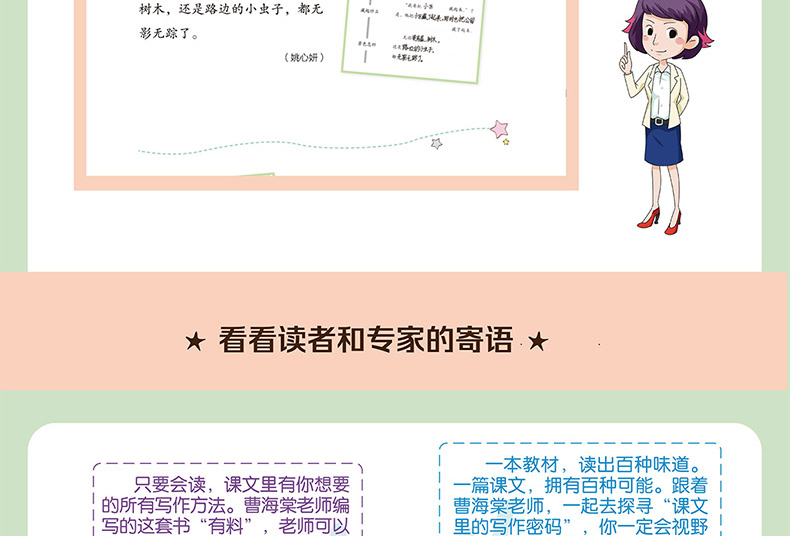 本册配合新课标部编版语文教材六年级下册使用,同步跟进课文教学,以教材选文为例子,帮助学生吃透课文、挖掘写作点、辅导小练笔等,与教材配合度高,操作性、针对性强。同时,引入“群文教学”“整本书阅读”等概念,注重语文核心素养的训练,在写作点呈现上更具灵活性与趣味性。是适合学生同步使用,减轻教师教学负担的优质助学读物。