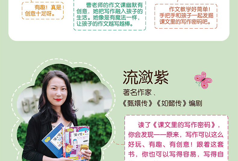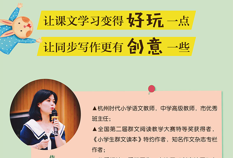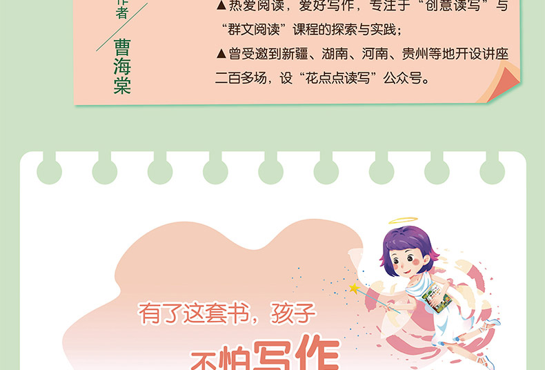 曹海棠,杭州市时代小学语文教师,中学高级教师,市优秀班主任;全国第二届群文阅读教学大赛特等奖获得者,《小学生群文读本》特约作者,《快乐作文》《少年作家》等杂志专栏作者:热爱阅读,爱好写作,专注于“创意读写”与“群文阅读”课程的探索与实践;曾受邀到新疆、湖南、河南、贵州等地开设讲座二百多场:开设“花点点读写”微信公众号。