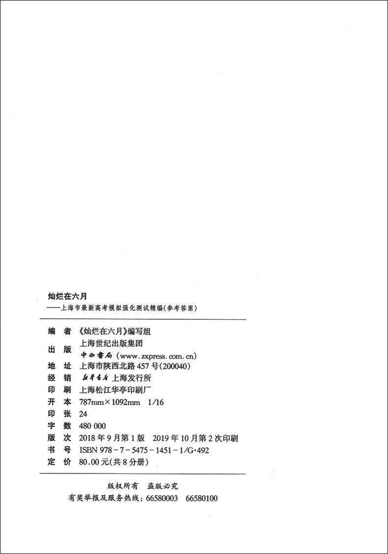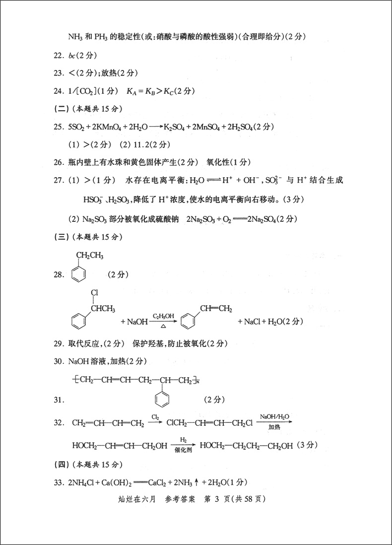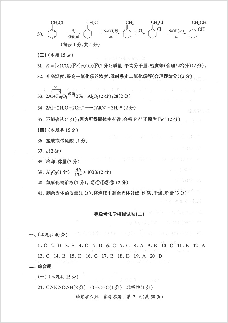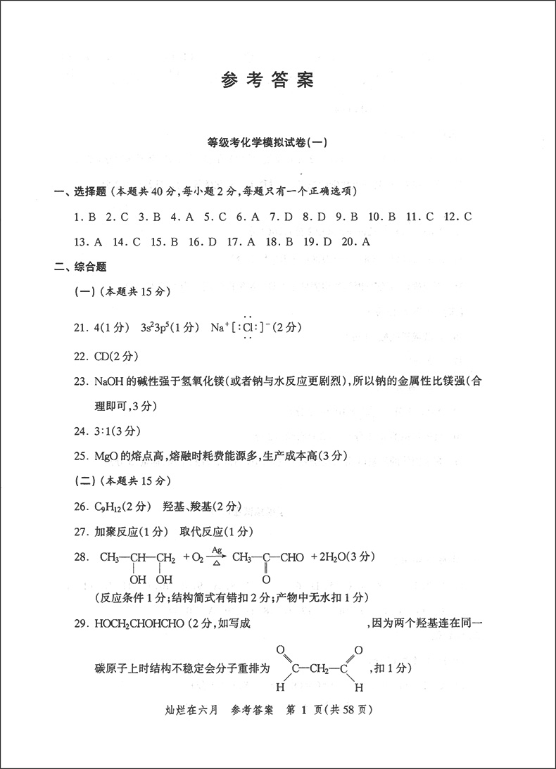 2021版 灿烂在六月 高考化学 参考答案 上海市新高考模拟强化测试精编 中西书局