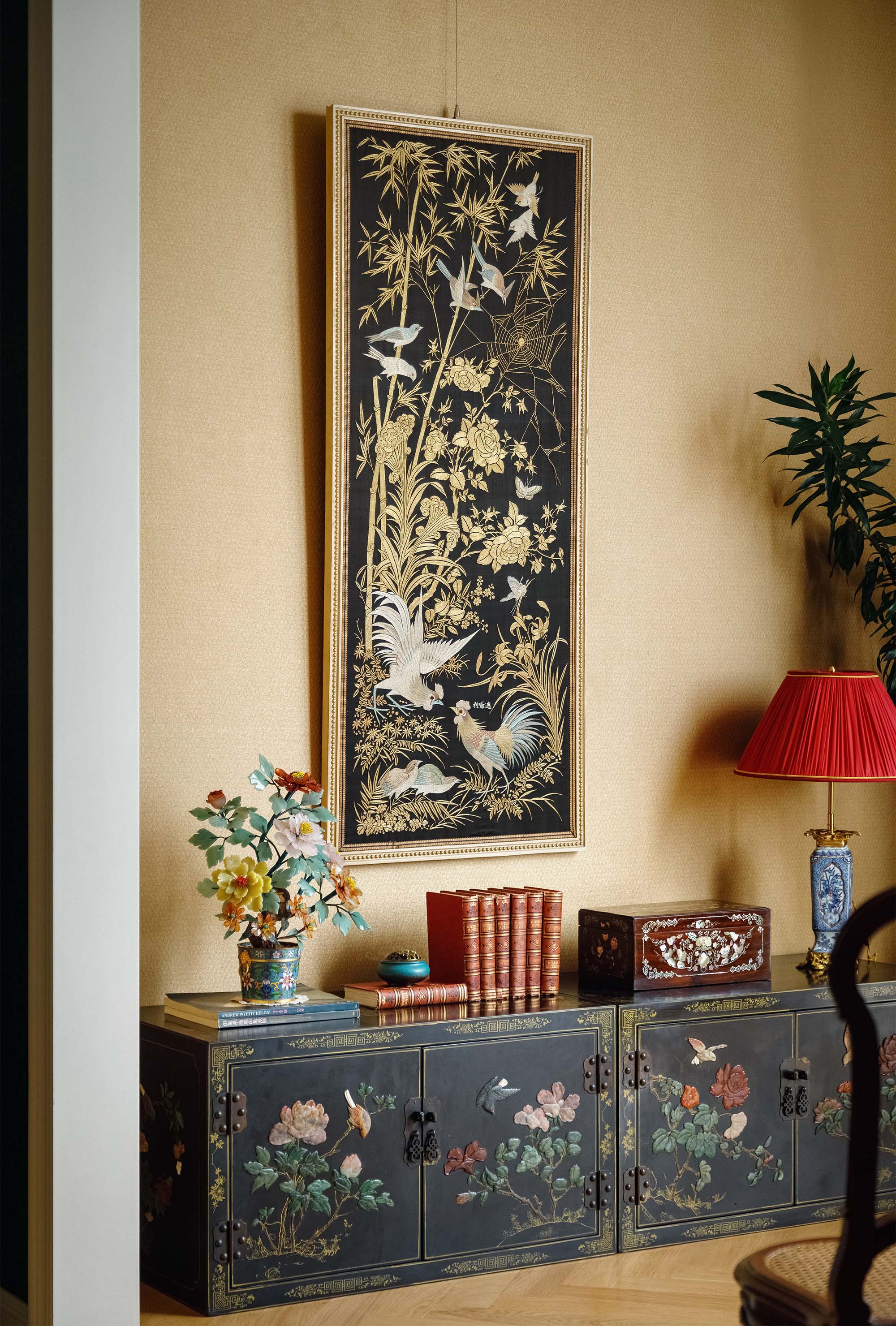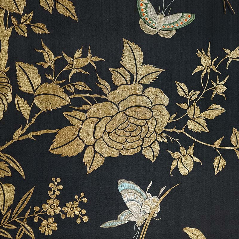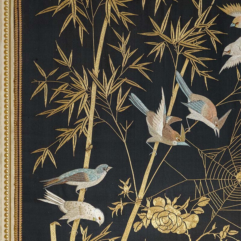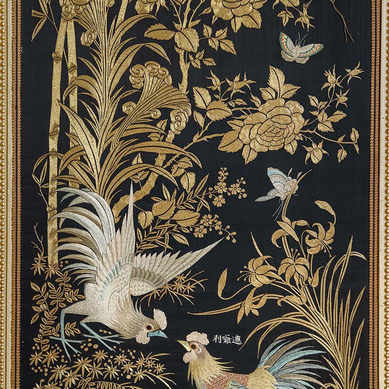 19世纪中国清代出品「官上加官」传统东方花鸟主题黑缎粤绣挂屏
