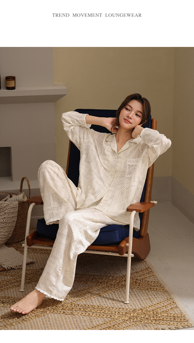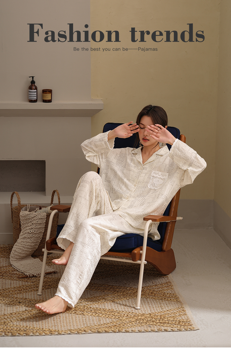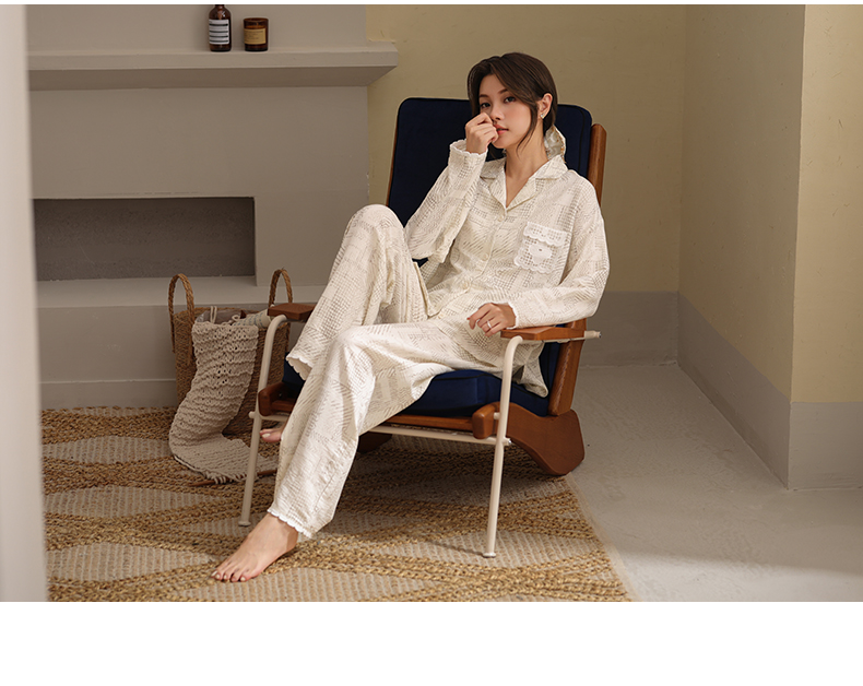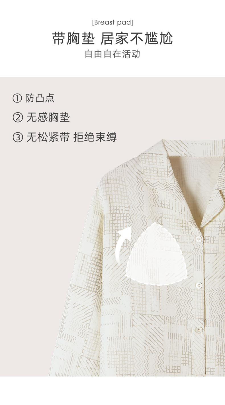 可人儿春秋季带胸垫泡泡绵女士长袖长裤睡衣可外出小众家居服套装