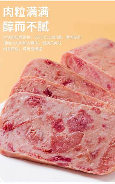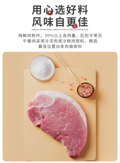 纯鲜肉制作,90%以上含肉量,区别于常见午餐肉采用冷冻肉或冷鲜肉原料。🥰