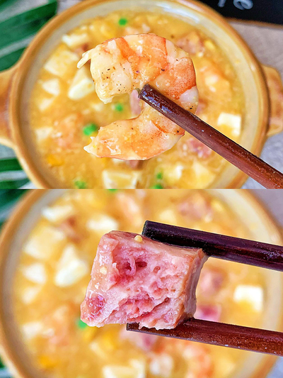 整颗玉米粒与大块肉粒的碰撞,一口咬下,大颗玉米粒在口中迸溅出鲜甜的汁水,咸甜的口感与诱人的肉香的融合带给你超多满足感。