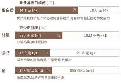 营养成份合理把控,基于原料选材和配方的优化,产品与常见同类品相比,蛋白质含量更高,减少不必要的添加剂和食盐比例,保留口味醇香的同时将钠含量尽量降低。