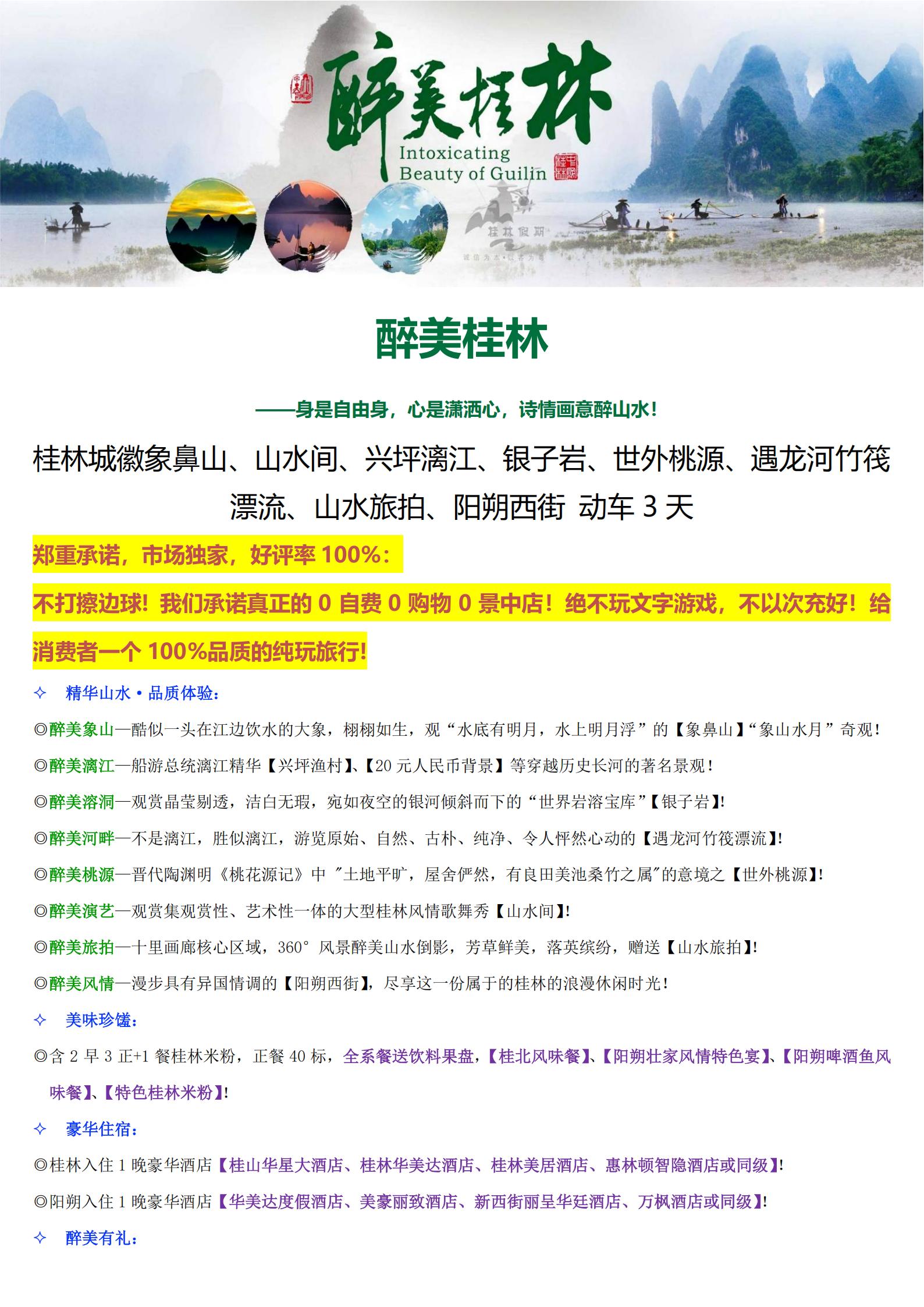 【清明节踏青】<桂林+阳朔3天动车团(20人精致小团)>象鼻山、山水间、兴坪漓江、银子岩、世外桃源、遇龙河竹筏漂流、山水旅拍、阳朔西街